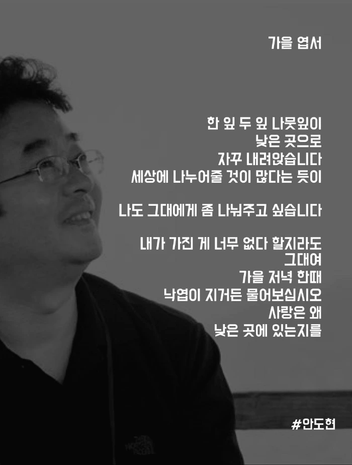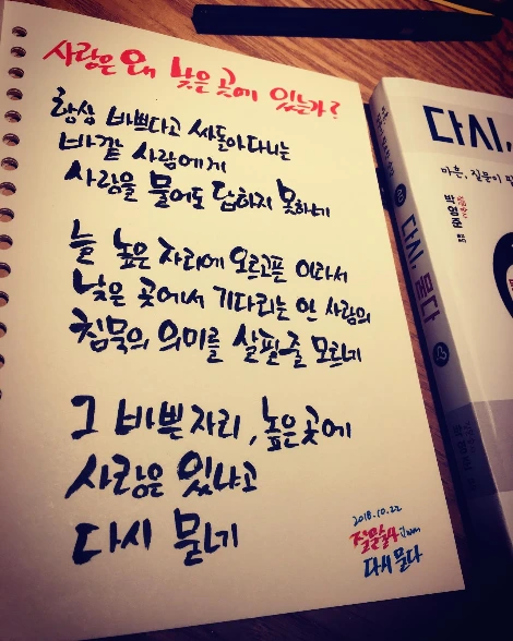 가을이 되니 안도현 시인의 글들이 깊이 스며들며 속살을 아프게 후벼판다. 아내에게 다가가서 손 내밀어야 할 때, 시를 끄적이는 바보가 나다. 아픈 아내를 두고, 여전히 일을 핑게로 밖으로 돌아다닌다. 사람들 앞에서 우쭐거리며 잘난 척 하지만, 높은 자리에 서서 사랑을 말하긴 쉬우나, 낮은 자리에서 사랑을 행하긴 어렵다. 늘 반복되는 나의 어리석음을 후회하면서도 쉬이 펜을 놓지 못하는 건, 여전히 나의 미숙함이다.