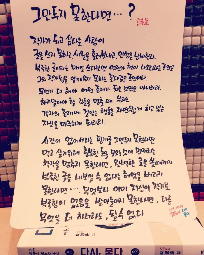 시간이 없어서라는 핑게를 그만두지 못한다면, 먹고 살기위해 충분한 돈을 모으는 것이 먼저라는 착각을 멈추지 못한다면, 완벽한 글을 쓸 때까지 부족한 글을 내보일 수 없다는 허영을 버리지 못한다면... 무엇보다 이미 자신이 작가로 부족함이 없음을 받아들이지 못한다면 다른 무엇을 더 하더라도, 될 수 없다.