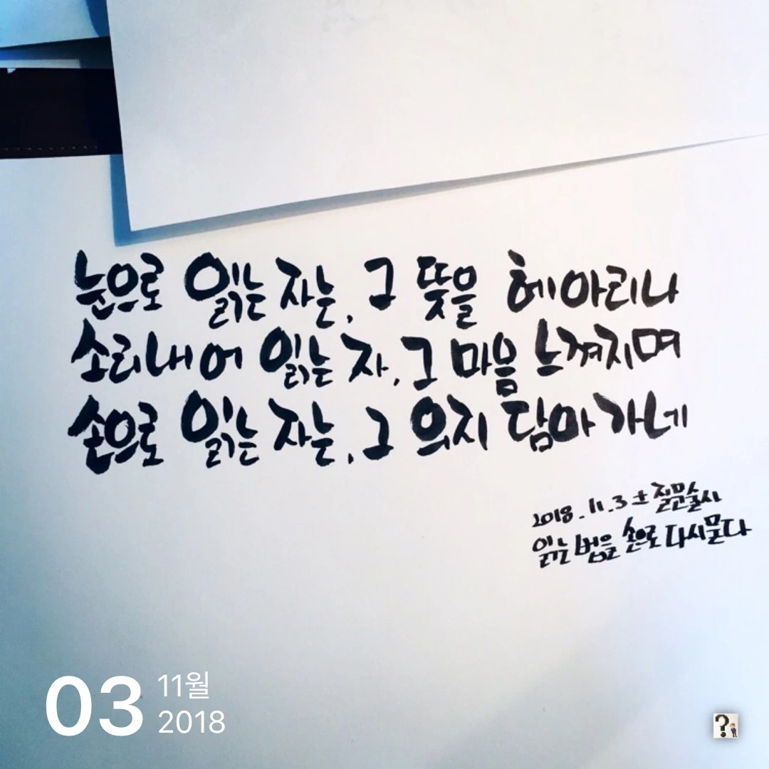 문득 궁금해졌다. 근래에는 시를 종종 읽는다. 시집으로도 읽고, 페이스북 친구들이 올려주는 시들도 읽어보다가, 마음에 드는 시는 옮겨둔다. 소리내어 다시 읽기도 하고, 바탕에 발도르프 습식수체화풍으로 그려진 그림을 깔아놓고 시를 옮겨붙이고 이미지카드로 만들어 보기도 한다. 이렇게 시를 읽는 놀이를 하면서 혼자만의 시간을 갖곤 하지만, 가장 마음에 드는 방식은, 붓펜 한자루 들고 삐뚤빼뚤한 내 글씨체로 직접 옮겨쓰는 것이 제일 좋더라.