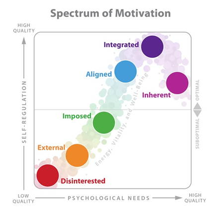 무관심, 외부, 강요 동기부여 관점은 부정적(Subotimal)이며 저차원적(Low Quality) 동기부여 관점이다. 연계, 통합, 내재 동기부여 관점은 긍정적(Optimail)이며 고차원적(High Quality) 심리적 필요를 반영하고 있다. 자신이 현재 하는 일에 어떤 동기부여 관점을 가지고 있는지 이해하고, 이 긍정적, 부정적 동기부여 관점이 자신의 행복, 단기적 생산성, 장기적인 성과 등에 미치는 여러 효과들을 면밀히 검토해 보는 작업은 굉장히 유익하다.