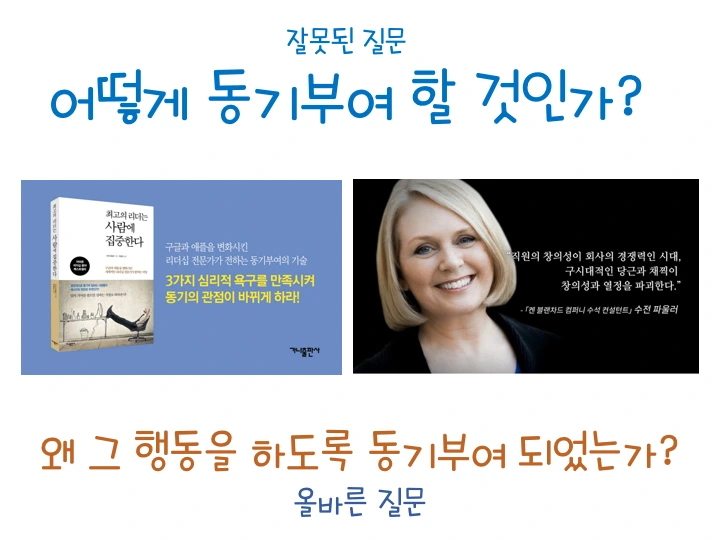 '어떻게 하면 남들에게 동기를 부여할 수 있는가?' 이것은 옳은 질문이 아니다. '어떻게 해야 남들이 스스로 동기를 부여할 수 있는 조건을 만들 수 있는가?' 바로 이것이 올바른 질문이다.