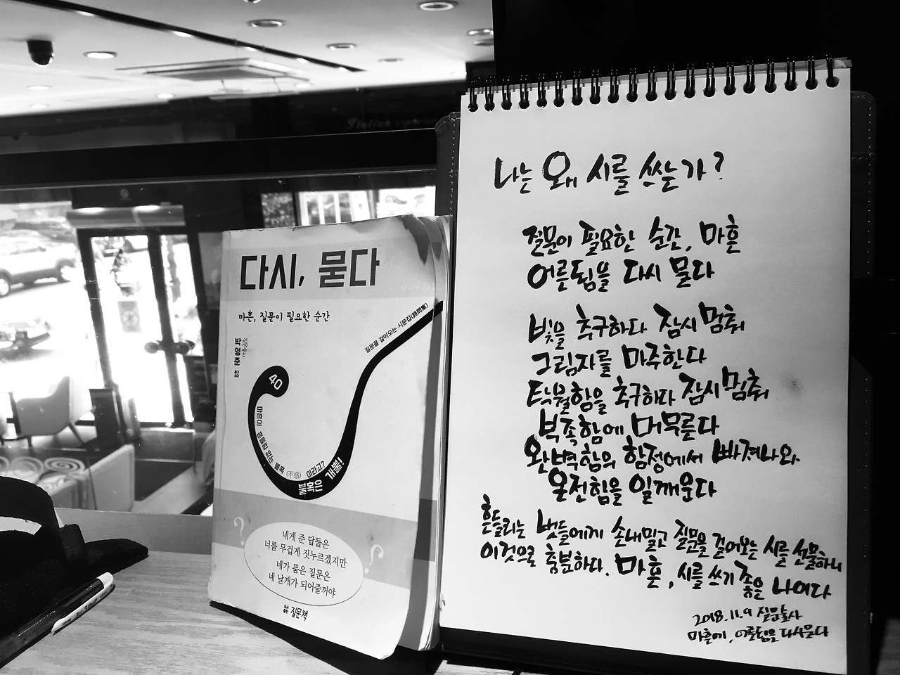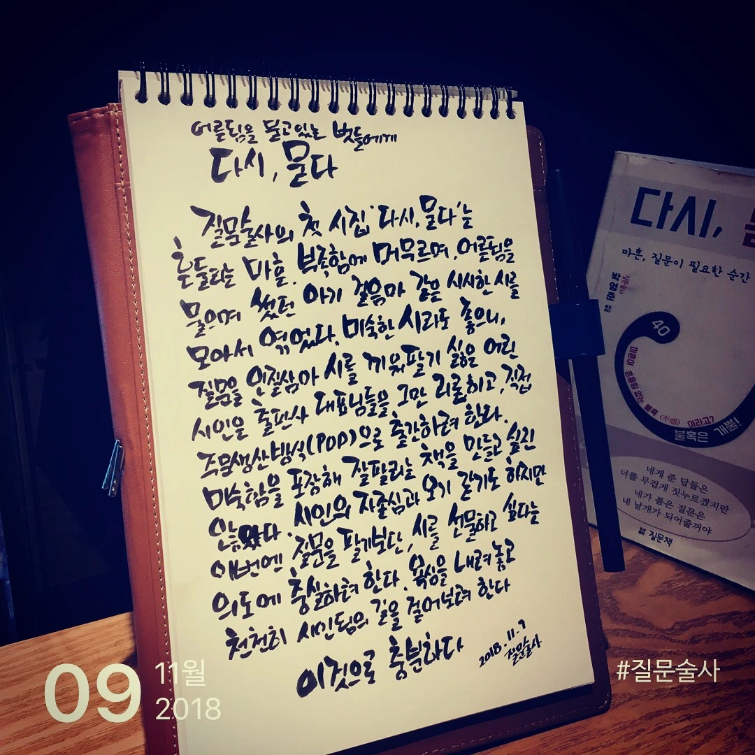출판사 대표님들을 여럿 만났다. 고맙게도 출간해보자는 곳이 4곳 정도 있었다. 미팅을 마치고 어떤 출판사와 해야 하는지를 검토하다가, 뭔가 찝찝함 같은 것을 느겼다. 4곳의 출판사 모두 '질문'관련 책을 내고 싶어하셨다. 나는 '시집'을 내고 싶었고. 많은 질문들이 담겨져 있긴 하지만, 이번 책은 질문책이라기 보다는 질문을 걸어오는 시집이 되길 바랐다. 미숙한 시라도 좋으니, 질문을 인질삼아 시를 끼워팔기 싫었다. 출판사 대표님을 괴롭히는 것을 그만두고, 직접 주문생산방식(POD)의 출판을 시도하기로 결정했다. 시인이 되고자 하는 질문술사의 자존심과 오기 같기도 하지만, 이번엔 질문을 팔기보단 시를 선물하고 싶다는 의도에 충실하려 한다. 욕심을 내려놓고 시인됨의 길을 걸어보려 한다.