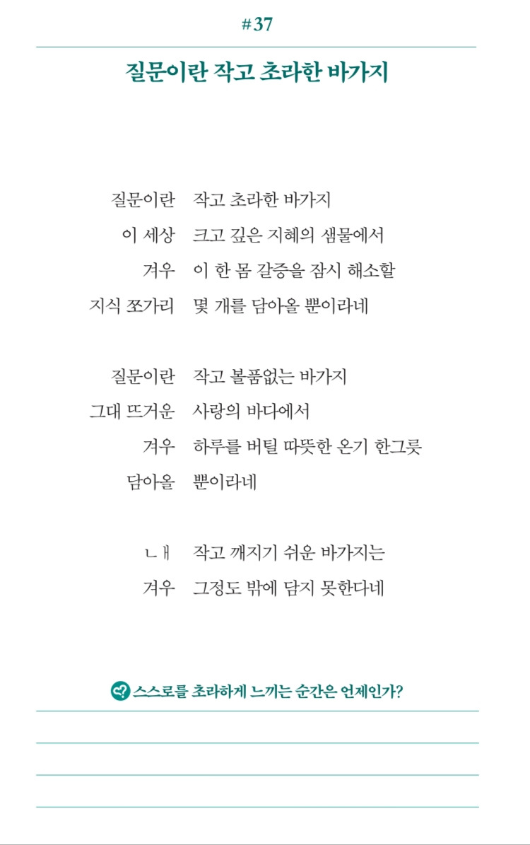 이 답답함을 풀어내고 싶어 '질문 바가지'를 주제로 시 한편을 끄적였다. 몇년 전에 익숙한 질문 하나를 다시 받았다. '당신은 누구입니까? 비유적으로, 상징적으로 정체성을 표현해보신다면?'이라는 질문에 떠올랐던 심볼이 '바가지'다. 목마른 이들이 갈증을 해결하려고 할 때, 물을 줄 수는 없겠지만, 바가지라도 되어 목을 축이는 일을 돕고 싶었다. 비록 작고 초라한 바가지로 살아가고 있지만 이렇게라도 쓰임이 있다니 아직 살아갈 이유가 충분하다.