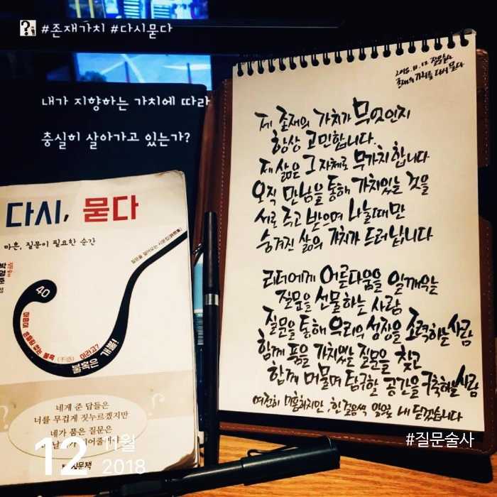 리더들에게 어른다움을 일깨우는 질문을 선물하는 사람, 질문을 통해 우리의 성장을 조력하는 사람, 함께 품을 가치있는 질문을 찾고 디자인해서, 함께 머물며 탐구할 공간을 구축하는 사람이 되고 싶어 질문디자인연구소를 만들었다.
