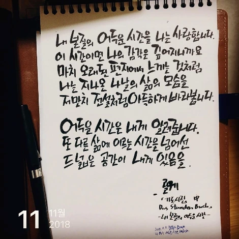 고통 속에서 질문을 멈추지 않고 삶을 긍정하라던 니체를 읽거나, 그림자를 창조의 원천으로 승화시킨 괴테의 글에 손이 간다. 당장 답할 수 없는 질문에는 그저 머물러도 좋다던 릴케가 생각나서, 어제 밤에는 '내 본질의 어두운 시간'이라고 노래한 릴케의 글을 끄적이며 옮겨 적었다.