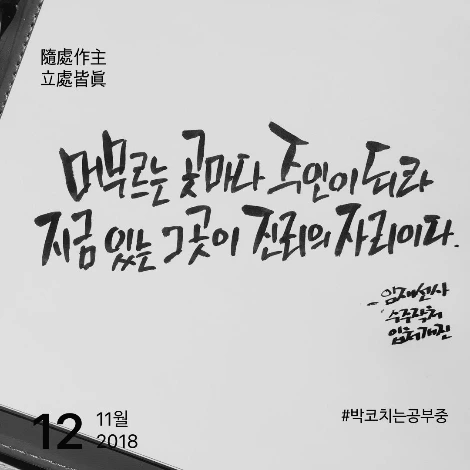 아침에 진성 리더십으로 리더들에게 북극성을 잊지 말라고 깨우쳐주시는 윤정구 교수님의 페이스북을 기웃거렸다. 내겐 또 다른 빛나는 어른이다. 오늘 올려주신 글을 '수주작처 입처개진(隨處作主 立處皆眞)'에 관한 글이였다. '머무르는 곳마다 주인이 되라. 지금 있는 그곳이 진리의 자리이다'