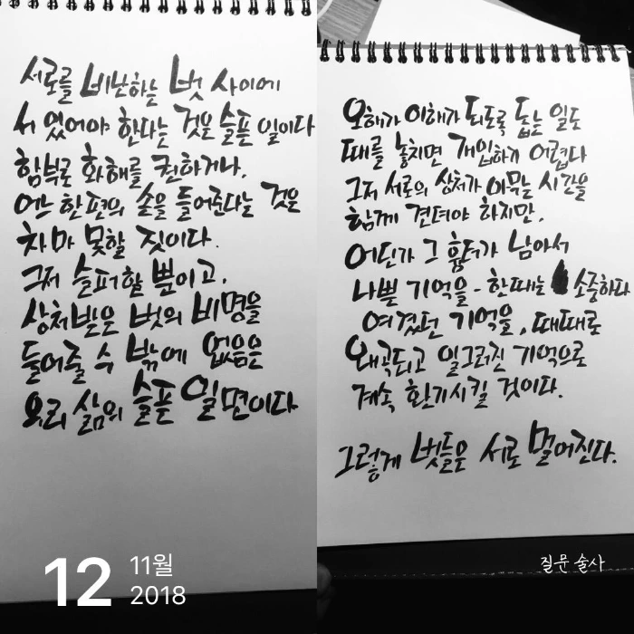 벗과 벗 사이의 일에 섣부르게 개입하는 것은 꼰대짓이다. 다만 서로 상처를 주고 거리를 두며 서로에게 들리지 않는 비난의 목소리를 쏟아내는 것을 볼 때마다 안타까울 뿐이다. 비난은 상대를 변화시키지도, 자기 자신을 위로해주지도 못한다. 서툰 벗들의 개입과 한 쪽 편의 이야기에 맞장구를 쳐주는 위로 정도는 기대할 수 있을지 모르지만, 그런 값싼 위로로 치유될 수 없는 상처임은 스스로 잘 알 것이다.