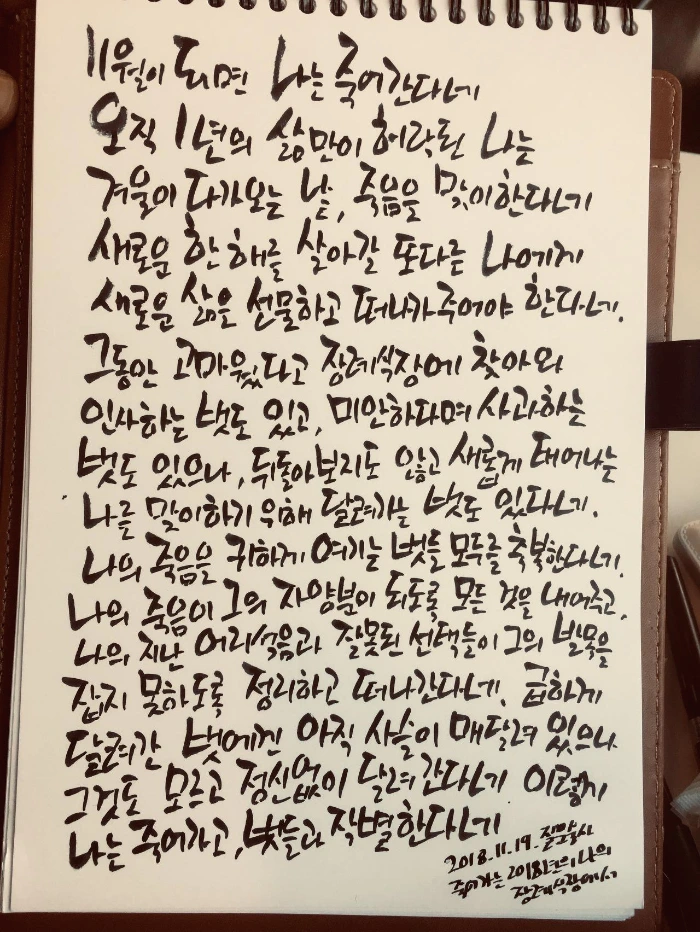지난 한 해를 열심히 살아온 나를 위해 조촐한 장례식을 치러보면 어떨까 하는 생각으로 끄적여봤습니다. 겨울, 봄, 여름, 가을... 저는 가을의 마지막 날, 11월 30일을 공식적으로 한 해의 마지막 날이라 생각하곤 합니다. 12월 1일부터 새해를 조금 일찍 시작해보는 것이지요.