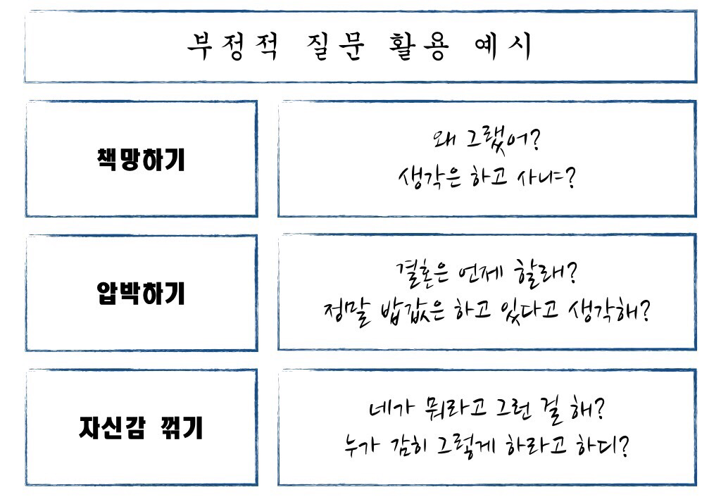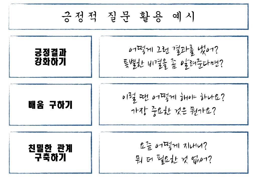 질문의 의도만 긍정적인 것이 아니다. 질문을 통해 일어나는 영향까지 긍정적이어야 한다. ‘긍정 중심의 질문’의 반대편에는 문제 중심의 질문이 놓여있다.