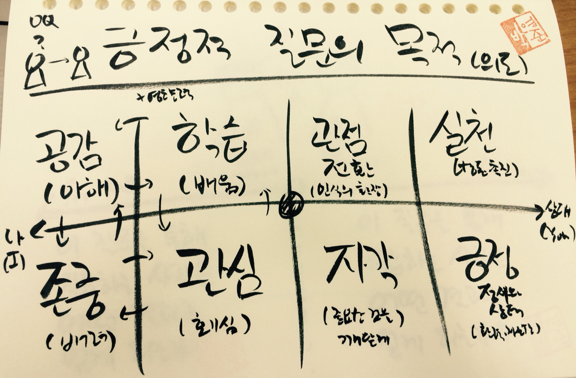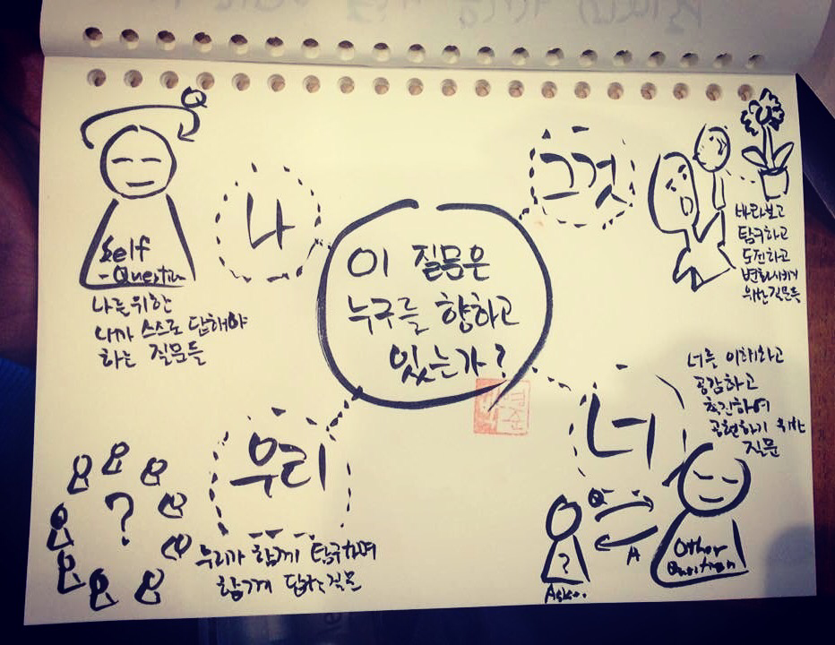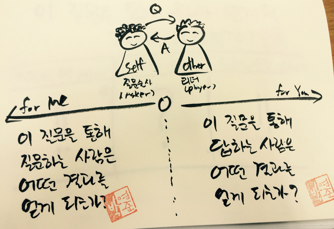 좋은 질문을 통해 상대를 만나게 된다면, 우리는 상대에 대한 존중과 관심을 바탕으로, 질문을 통해 공감과 이해에 이르고, 상대와 상대방의 세계에 대한 깊은 배움을 얻을 수 있게 된다.