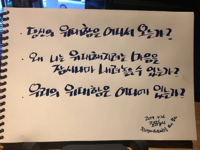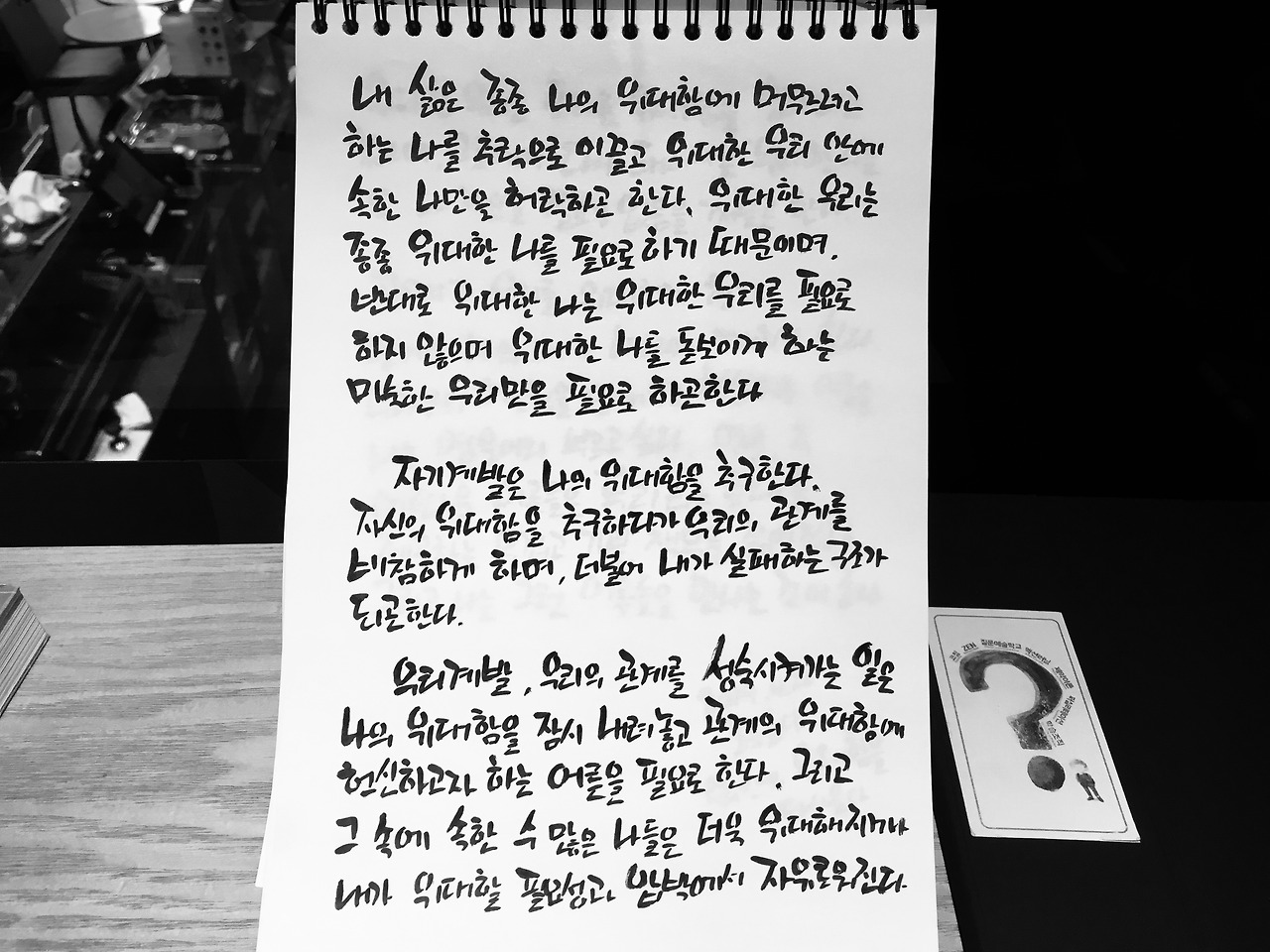 내 삶은 종종 나의 위대함에 머무려고 하는 나를 추락으로 이끌고, 우리 안에 속한 나만을 허락하곤 한다. 위대한 우리는 종종 위대한 나를 필요로 하지만, 위대한 나는 위대한 우리를 거부한다. 위대한 나를 돋보이게 하는 무숙한 우리만을 필요로하는 나는 실로 위대한 것이 아니라, 위대해지고 싶은 초라한 나일 뿐이다.