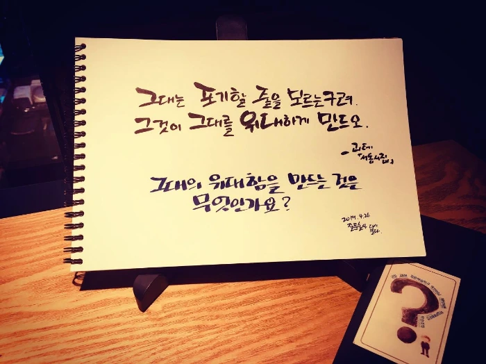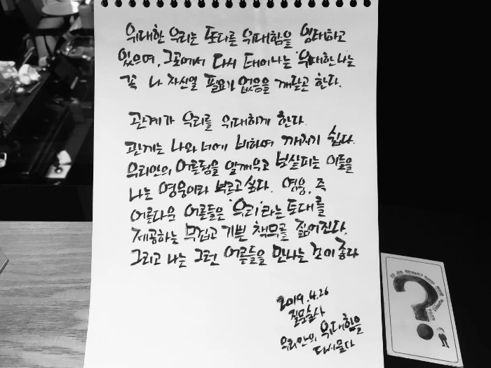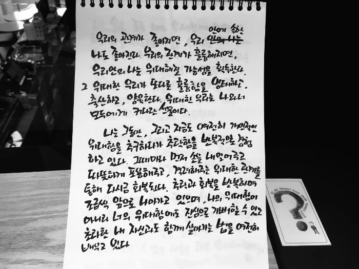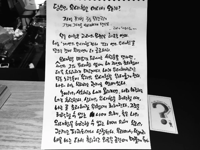 위대한 우리는 또 다른 위대함을 잉태하고 있으며, 그곳에서 다시 태어나는 '위대한 ㄴㅏ'는 꼭 나 자신일 필요가 없음을 깨닫곤 한다. 관계가 우리를 위대하게 한다.
