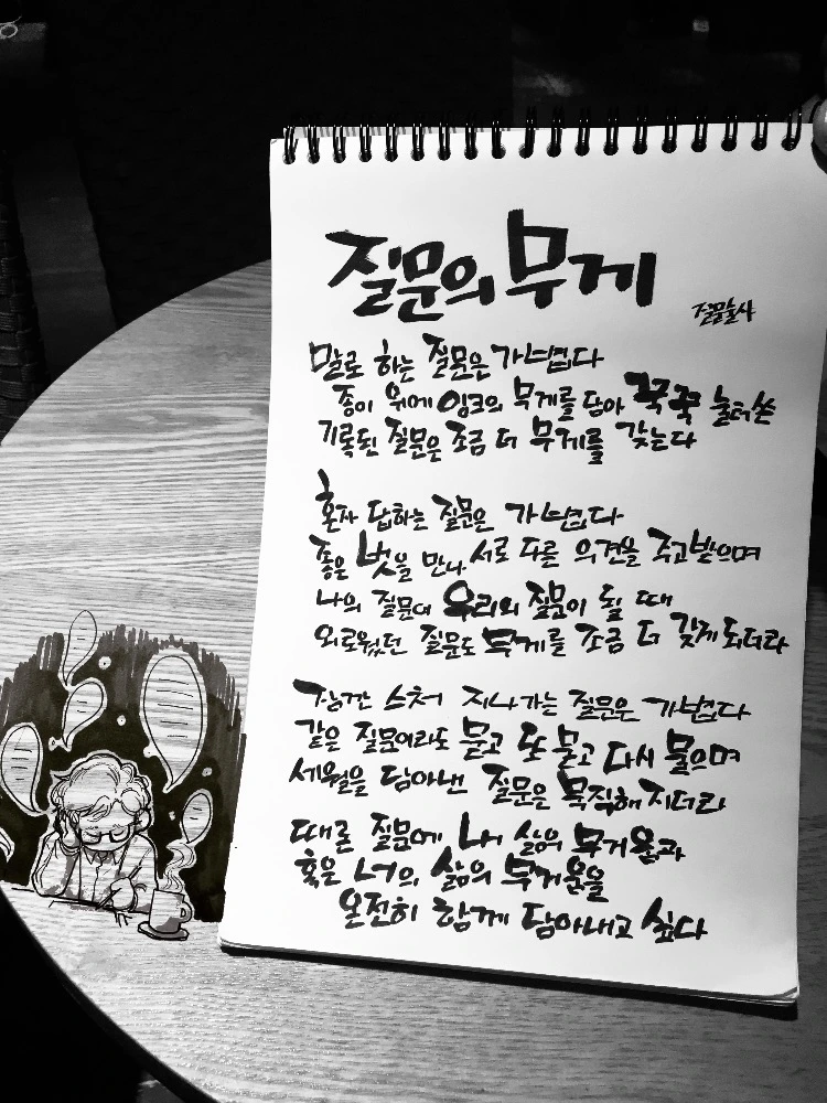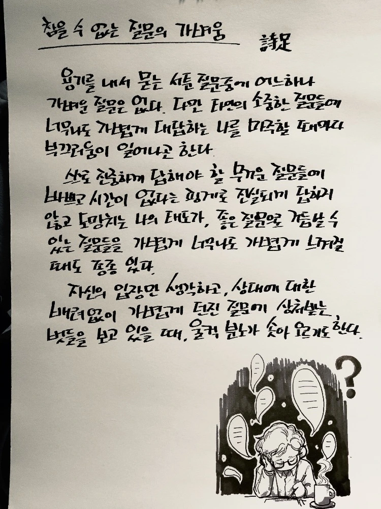 무거운 질문으로 힘들어하는 이에겐, 질문을 쪼개어 무거움을 덜어주어야 하고, 너무도 가볍게 질문하는 이들에겐 함께 머물며 질문에 체중을 실어서 머물게 하는 것이 좋더라.