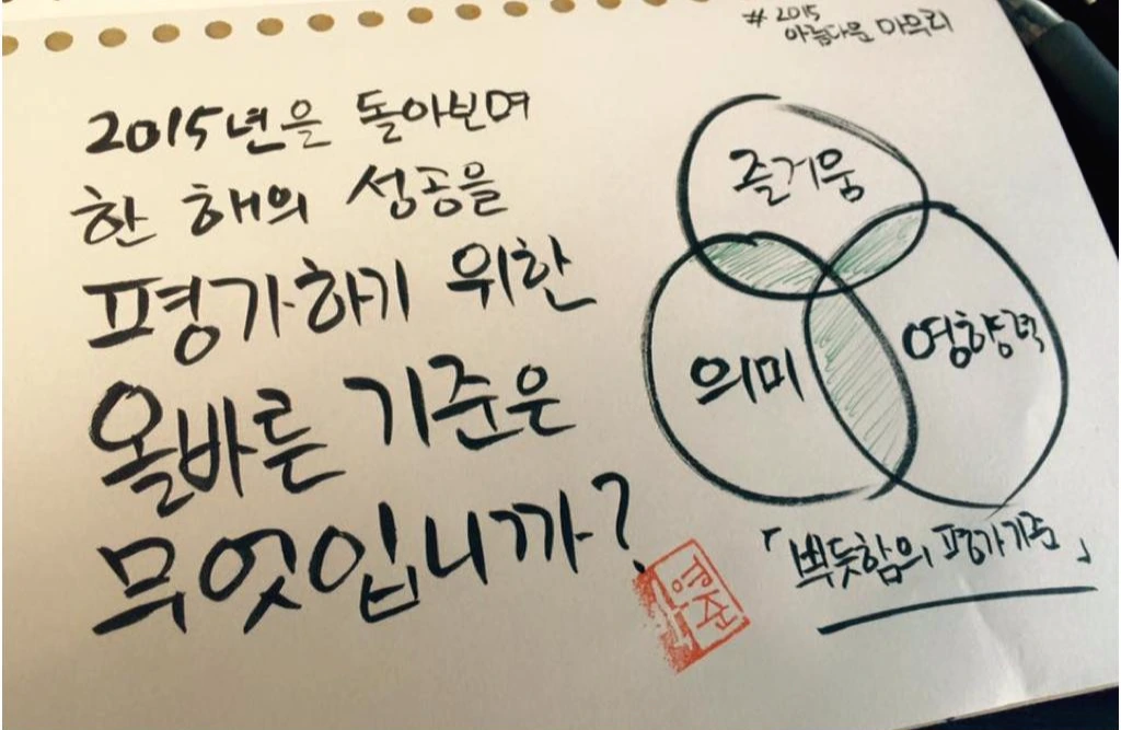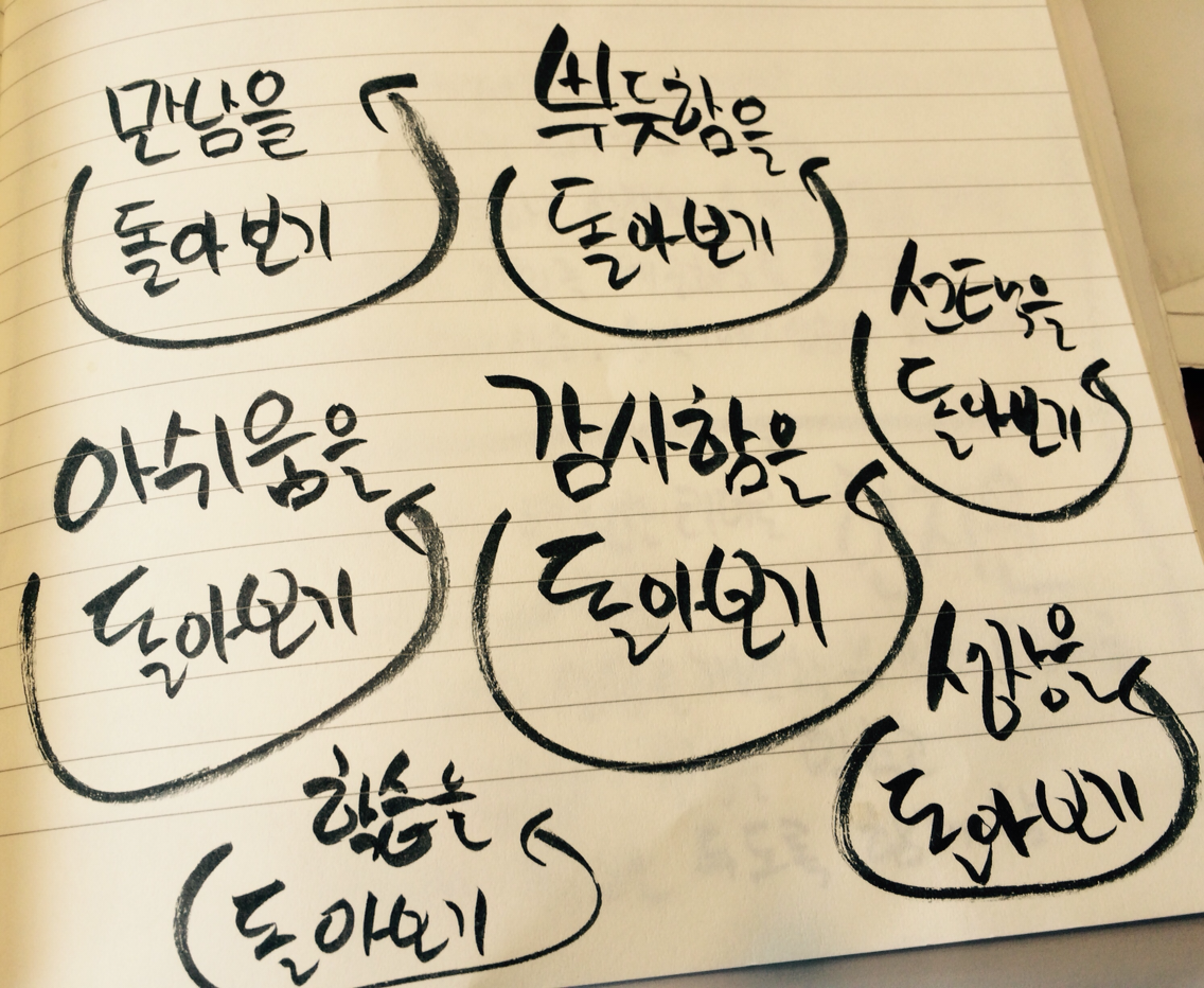 제 첫번째 가치인 '즐거움'을 기준으로 성찰하자면, (1)가족과 함께 한 제주도 여행, (2) 평생 처음 해본 배추머리 파마머리(저를 볼때 마다 사람들에게 웃음과 즐거움을 주고 있네요), (3) 홀로 붓펜을 들고 느리게 끄적이는 질문 디자인 놀이가 제 즐거움의 원천이였습니다.