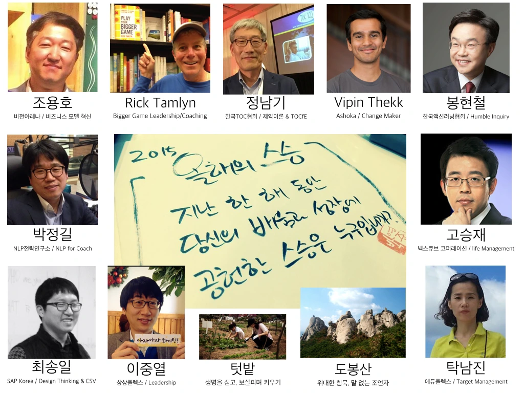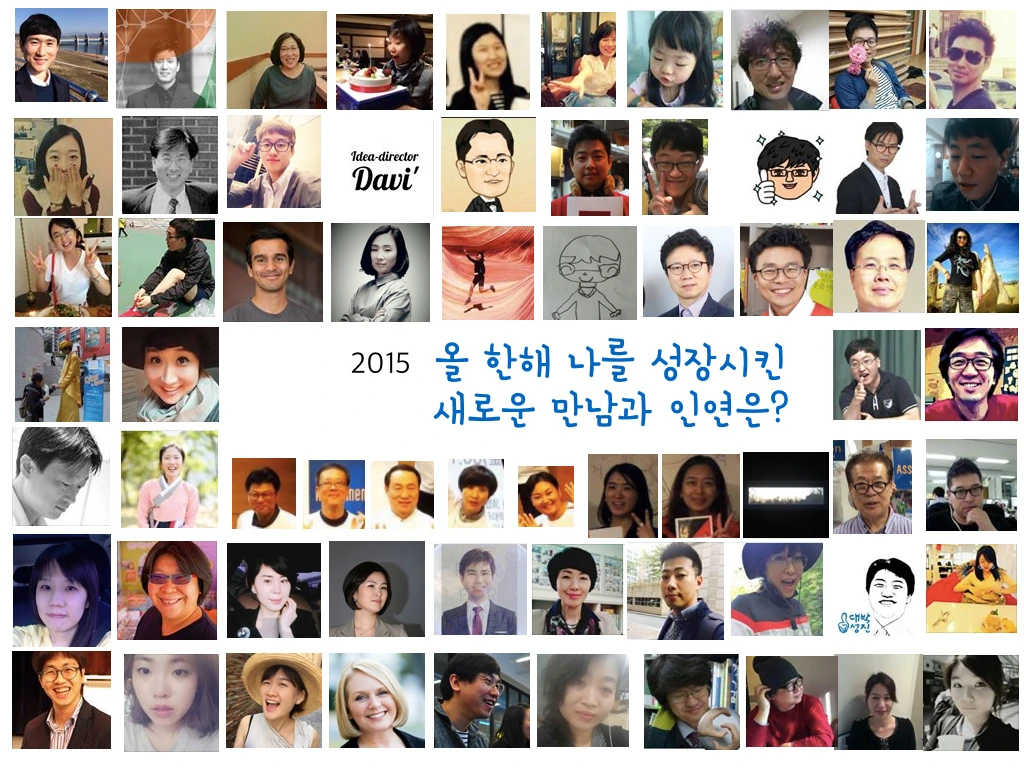 지난 1년간 제 자신을 성장시킨 만남은 무엇이였는지, 누구와 만났는지를 정리해보는 작업이 제겐 가장 중요한 성찰 중 하나입니다. 그동안 페이스북 친구 혹은 얼굴말 알고 지내다가, 올해 비로소 새롭게 인연을 맺게 된 분들, 스쳐 지나가듯 만났지만 큰 인사이트를 주신 분들을 정리하다보니 한 장에 모두 담을 수 없다는 사실을 알게 되었습니다. 매년 새로운 만남이 찾아옵니다. 그리고 또 헤어짐도 있습니다. (귀한 만남을 가진 후 제가 빠뜨린 분들이 너무도 많아 송구합니다. 페이스북에서 자주 교류해 찾을 수 있는 분들을 먼저 모셨습니다. 함께 정규 교육에서 만나거나, 따로 대화 나누지 못한 분들은 여기 모시지 못했습니다. 내년에 더 여유있게 만나 대화할 필요가 있다고 생각해 주시면 좋겠습니다.) 내년에는 더 깊고 즐거운 관계로 발전시켜 나갈 수 있기를 기원합니다.