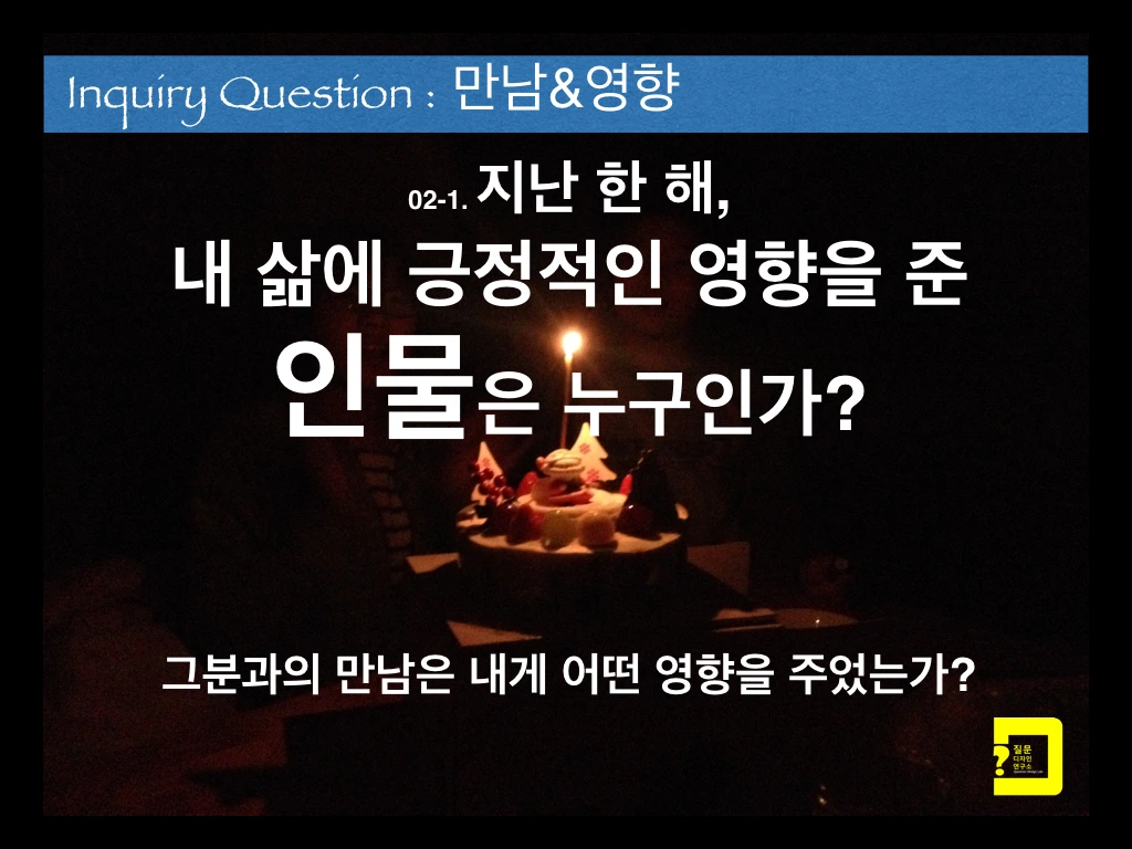 1) 올 한 해, 여러분의 삶을 풍요롭게 한 새로운 만남과 인연이 있다면, 누구입니까?