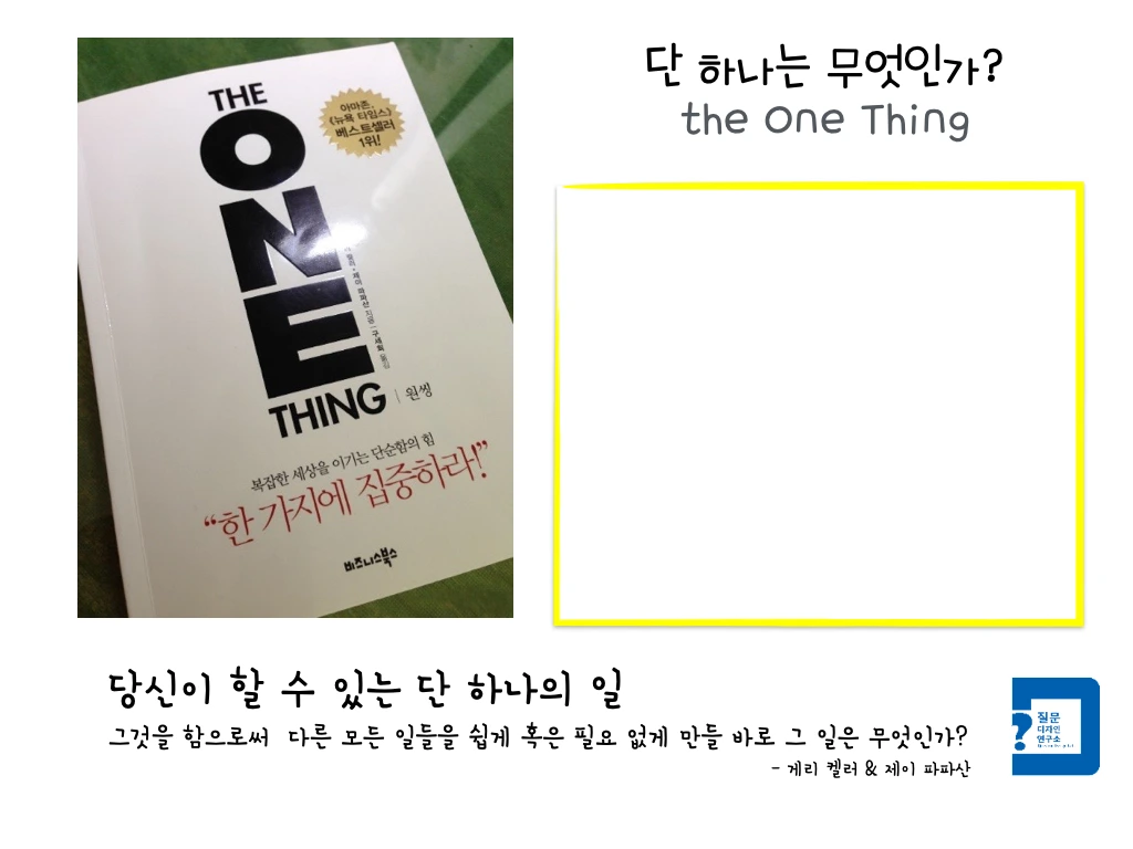 일단 여러분의 새해 목표 리스트 중 단 하나의 목표를 선택해 보셨으면 합니다. 여러가지 목표를 동시에 고민하려 하지 마시고, 단 하나의 목표(the One Thing)를 선택하길 권합니다.