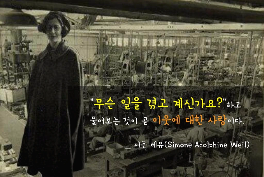 '"무슨 일을 겪고 계신가요?"하고 물어보는 것이 곧 이웃에 대한 사랑이다.' _ 시몬 베유