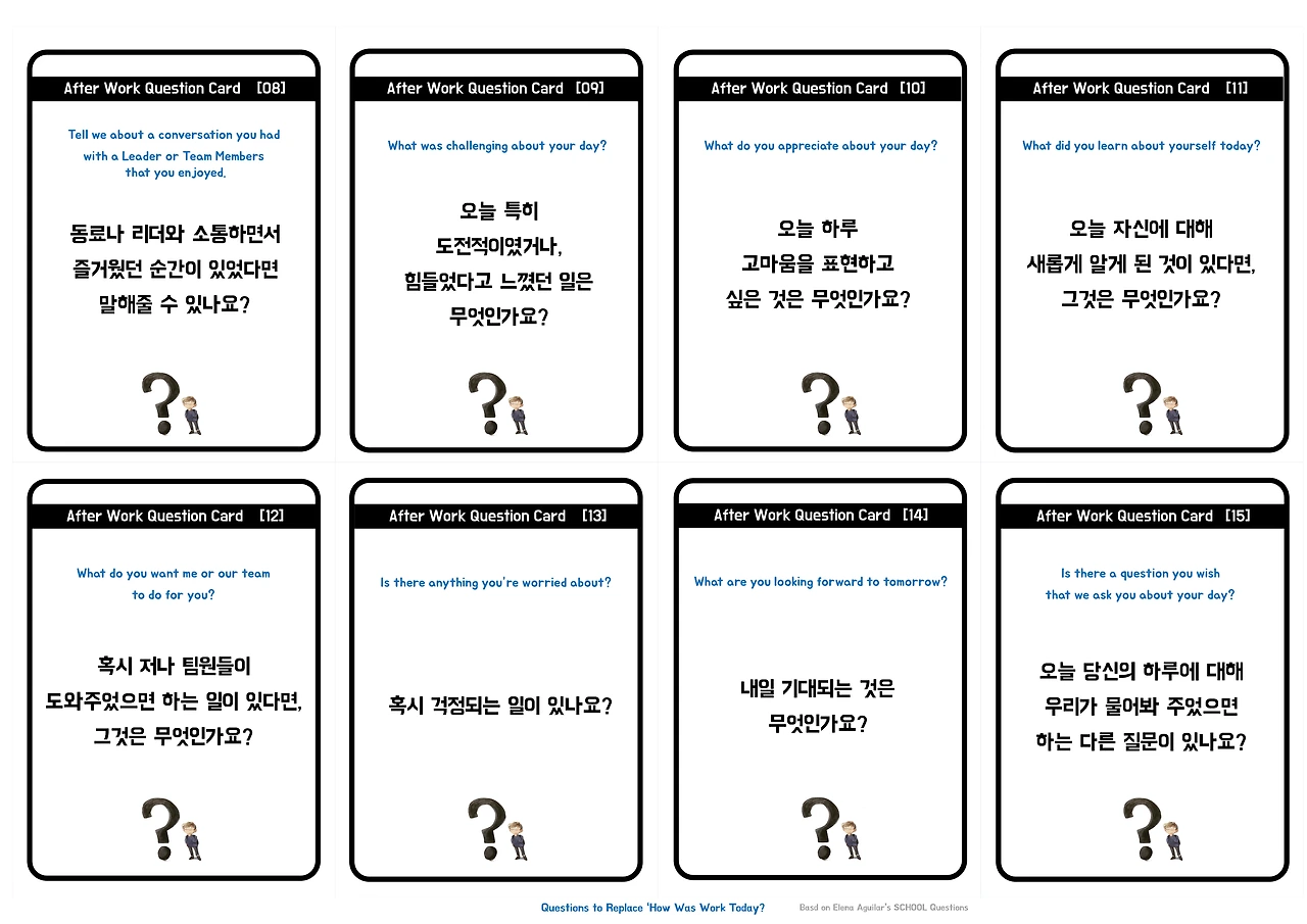 우리 애들은 이런 질문 싫어하고(아빠가 질문술사인데 질문 너무 많이 해 역효과? 음...), 그리고 전 일터 없는 프리한 삶을 사니 일 버전도 테스트 못 해 봤습니다. 테스트 해 보신 분들의 피드백 기다리겠습니다.