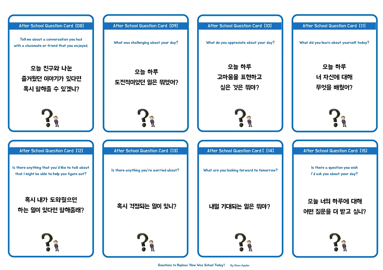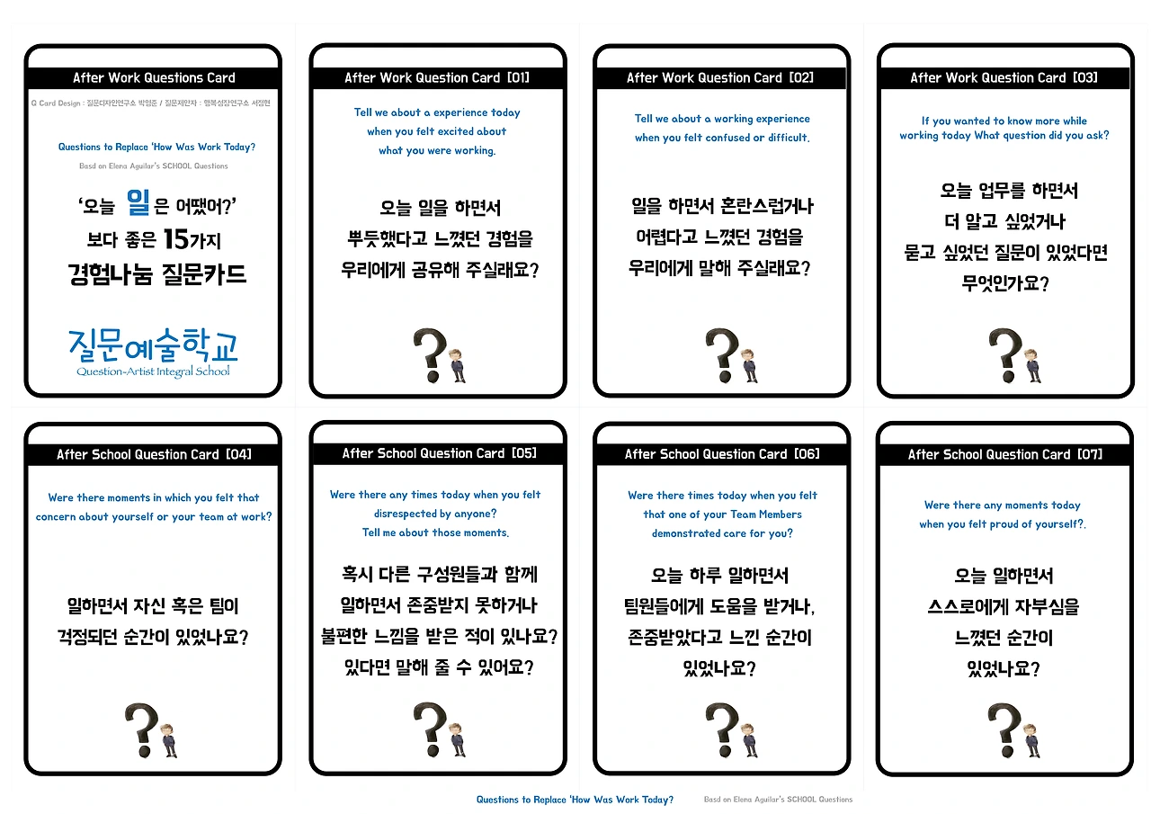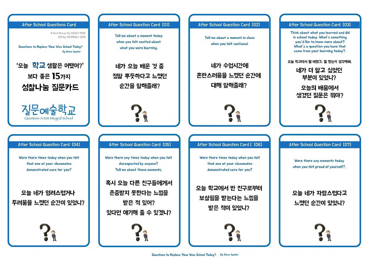 참고 : 영어 전공자가 아니기에 번역은 저의 친구들의 도움을 받았습니다. (질문 부분은 신은희 선생님이 해 주셨고, 앞 / 뒤 설명 부분은 최은숙 선생님이 해 주셨지요, 제가 문장 몇 개만 조금 수정하였습니다. 그리고 이 질문들을 학교와 직장에서 활용하기 쉽게 하기 위해 카드 형태로도 만들어보았습니다. 직장용 질문은 서정현 님께 도움받았습니다. 번역이 어색한 부분은 언제든 의견 주셨으면 합니다.)