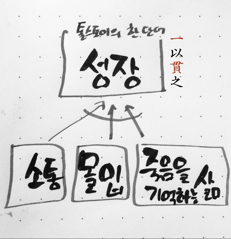 톨스토이의 한 단어는 성장이고, 이를 위해 소통과 몰입, 죽음을 기억하는 삶을 방편으로 삼았다. 인간은 누구나 살아 있는 동안 성장을 거듭해야 한다는 것이다. 소통은 잘 만나자는 뜻일 터이고, 몰입은 소중한 일에 몰두해 살아가자는 이야기일 터이고, 죽음을 기억하는 삶은 주어진 인생을 후회 없이 살아가자는 뜻일 터이다.