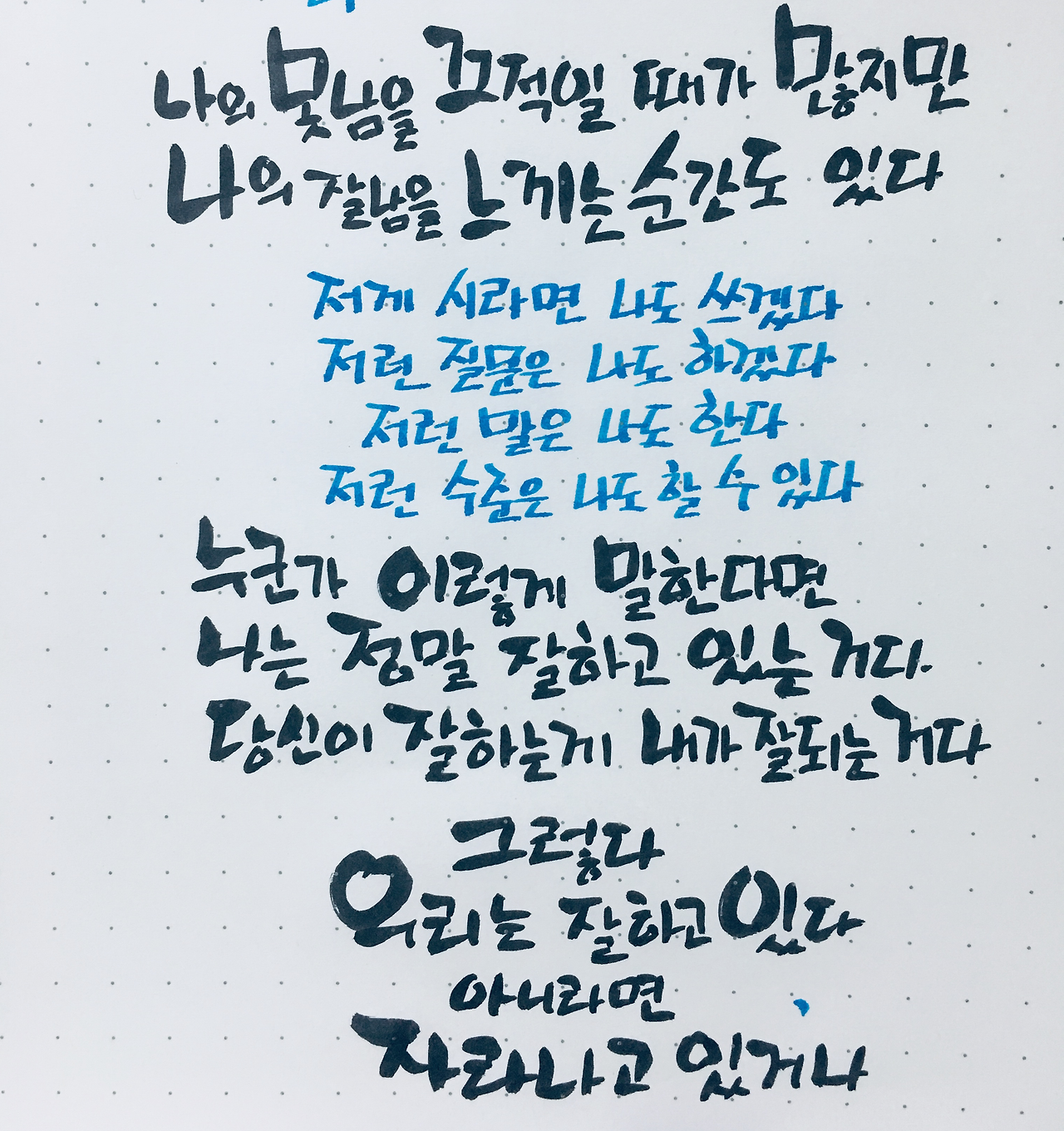 (내가 아니더라도 ‘못함’을 지적하는 ‘손가락들’은 도처에 너무도 많다. 특히 자기 내면에도 있다.)