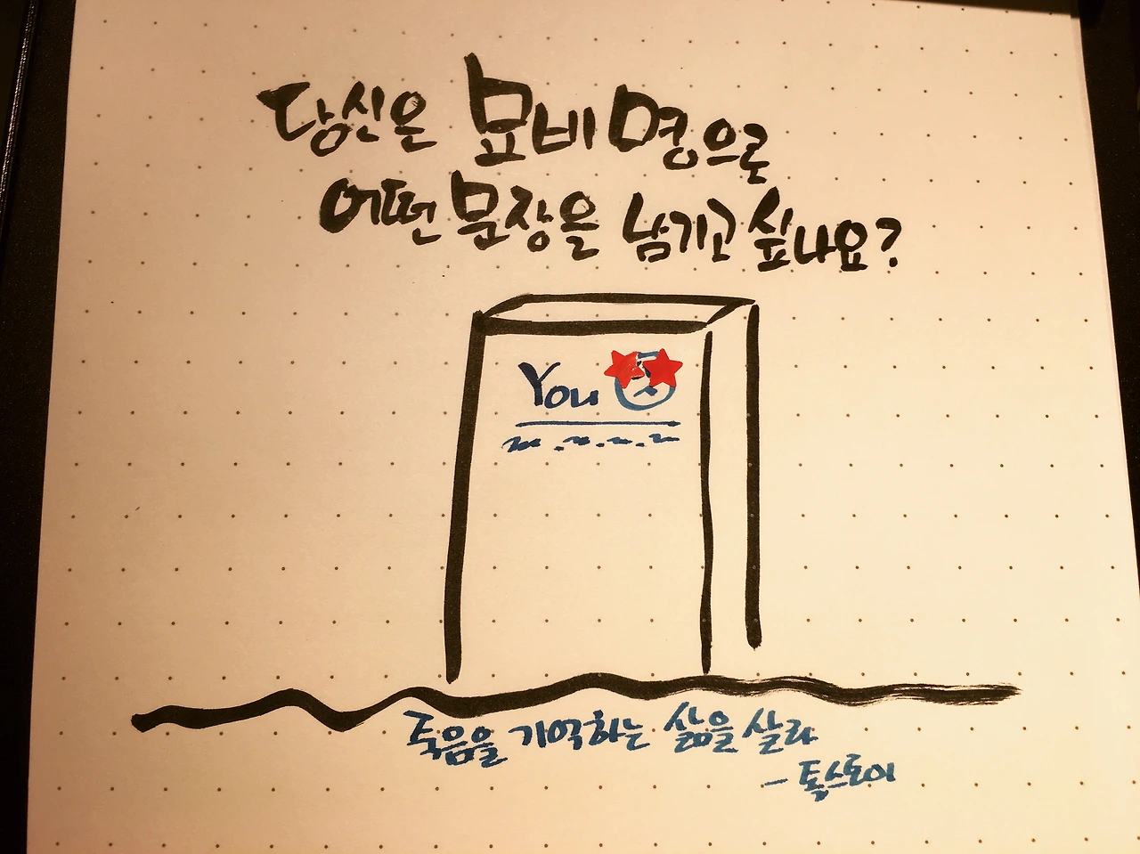 톨스토이는 '소통, 몰입, 죽음을 기억하는 삶'을 통해 성장하길 권했다. 어리석게 나도 내가 언제든 죽을 수 있음을, 혹은 내가 사랑하는 이들이 언제든 내 곁을 떠나갈 수 있음을 망각하고, 삶을 낭비하곤 한다. 그래서 죽음을 기억하기 위한 작은 활동으로 '나의 묘비명'을 만들어보았다.