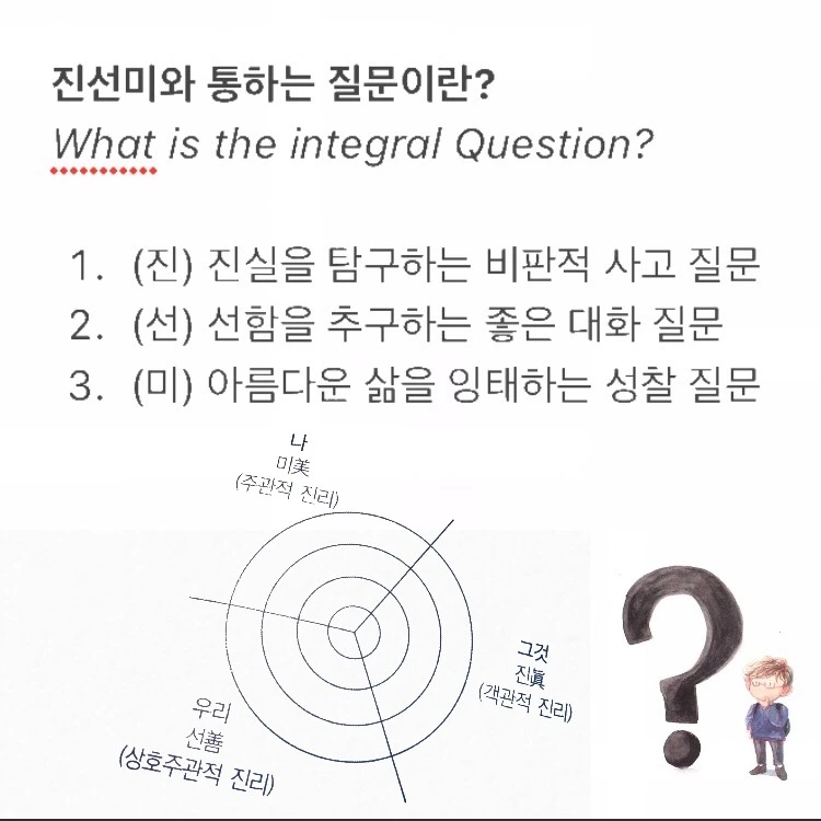 켄 윌버의 통합이론(Integral Theory)에 한동안 깊이 빠졌었다. 진선미(眞善美) 삼대 가치는 서양 철학의 주요한 주제 중 하나다. 진실과 착함, 그리고 아름다움을 분별하고 통합해 바라보는 훈련은 지금도 계속하고 있다. 특히 '좋은 질문(Good Question)'이라는 내 최근 질문 탐구의 주제는 '착함(善)을 어떻게 질문에 녹여낼 수 있을까?'라는 문제의식이 반영되어 있다.
