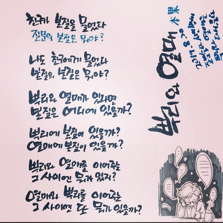 통하는 질문수업 학습자가 질문의 본질을 물었다. 무거운 질문이었고, 내겐 좋은 질문이었다. 그 질문에 바로 답하지 못하고 궁리하고 궁리했다. 일단 내가 이른 답은 ‘다시, 만남’이다. (이 뜻은 차후 다시 풀어 설명하고 싶다)