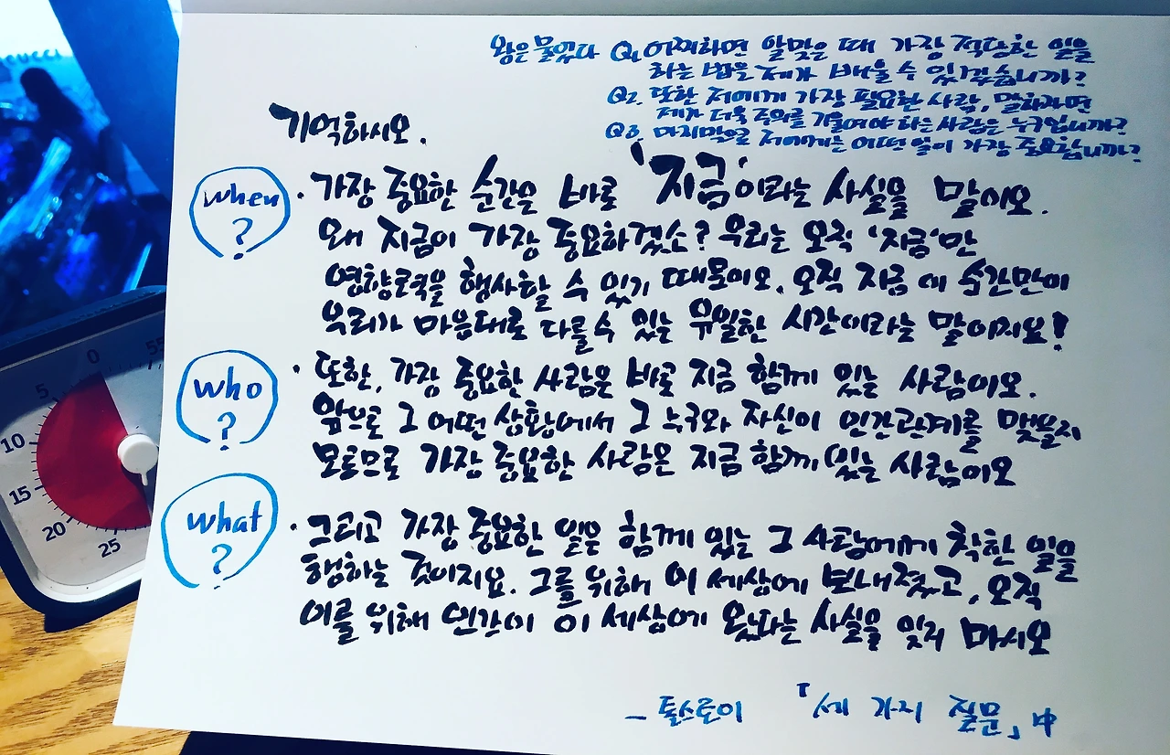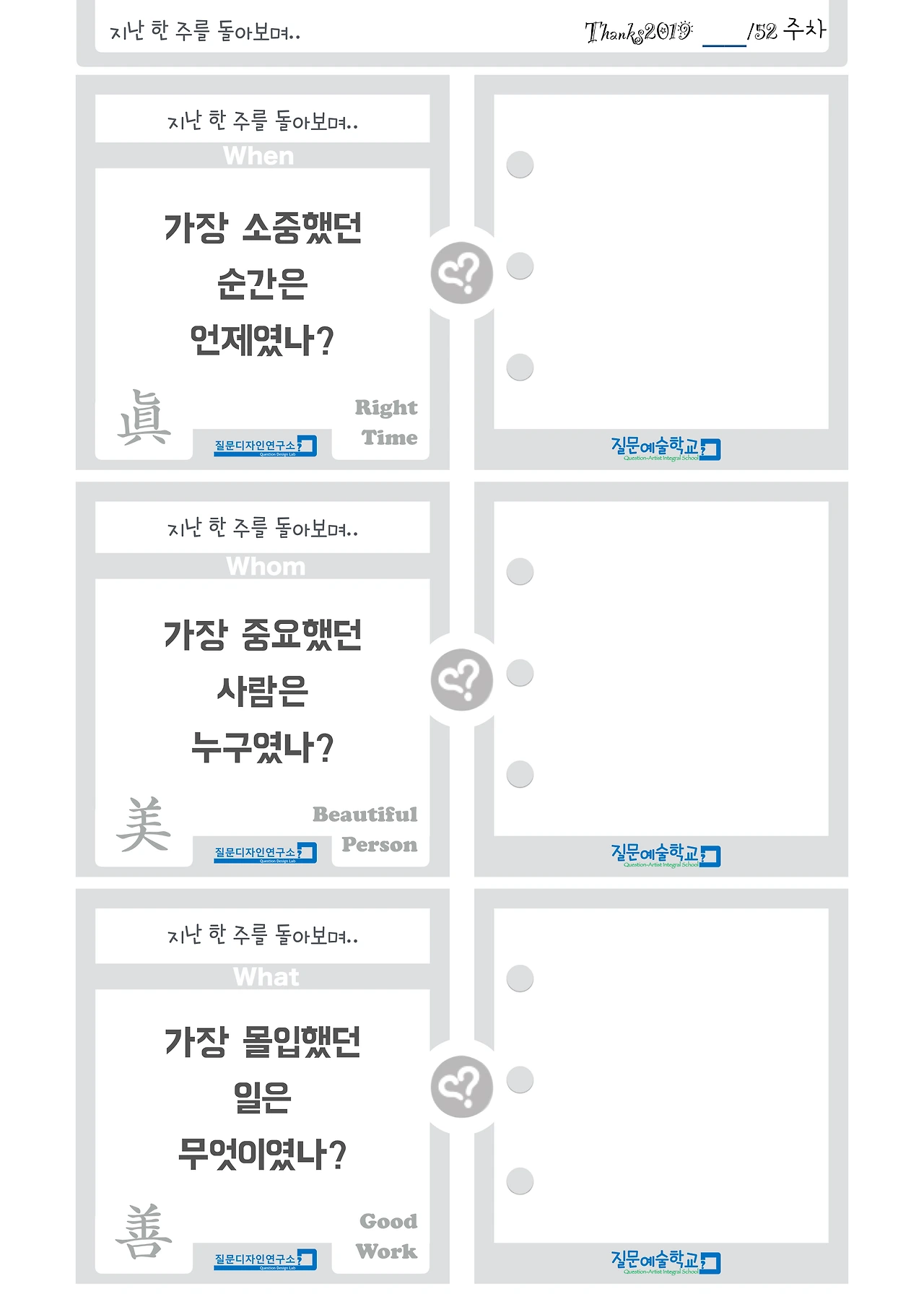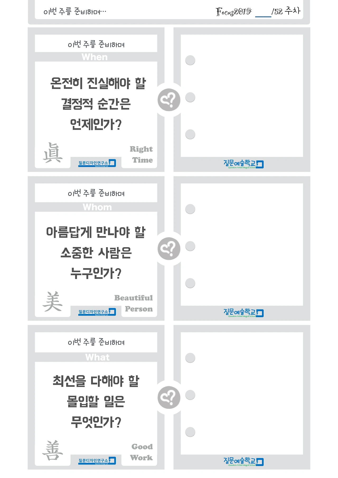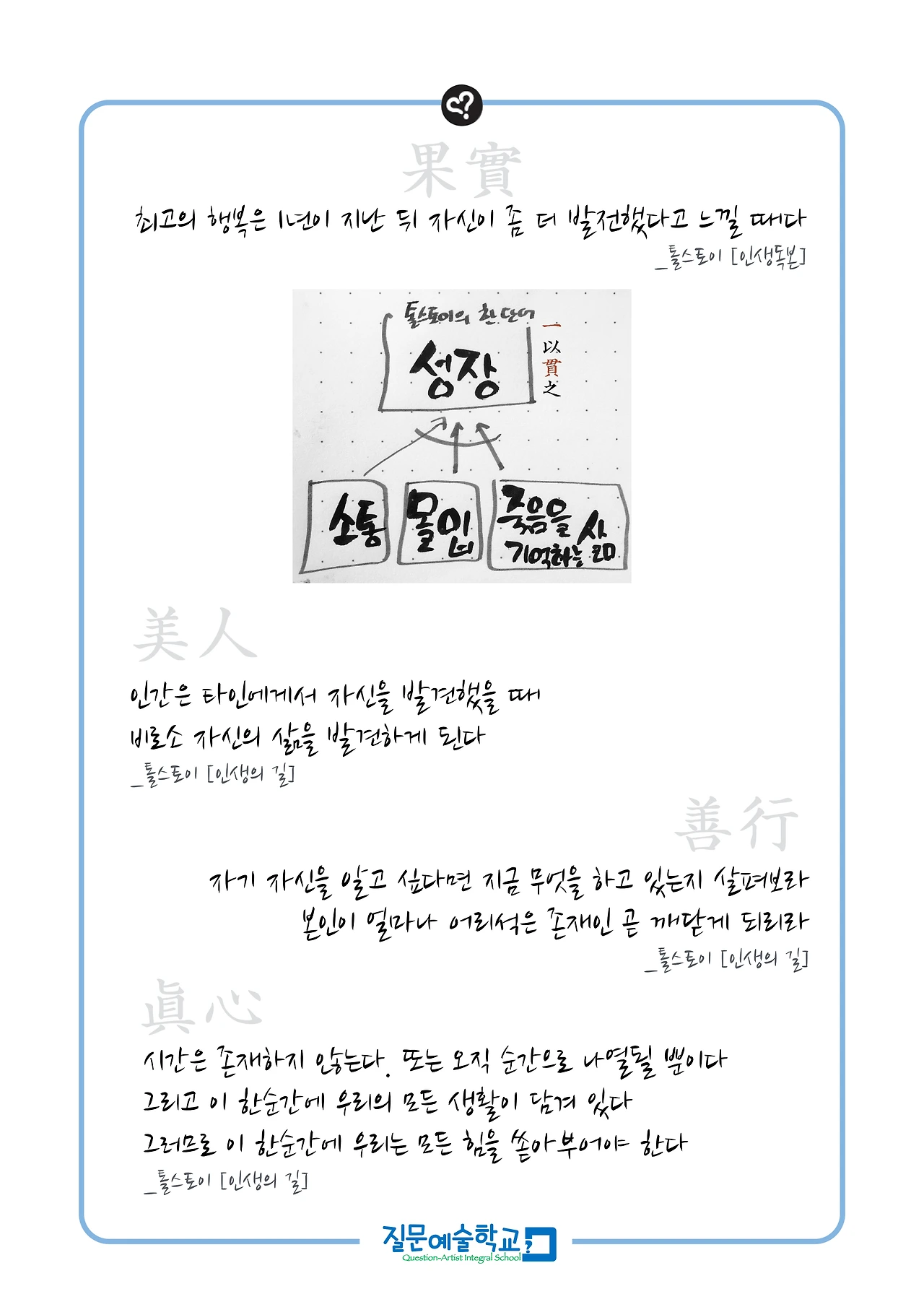 저는 톨스토이의 세 가지 질문이 인류의 삼대 가치라 불리는 진/선/미를 반영하는 질문이라 여기고, 진실한 순간, 아름다운 만남, 착한 일을 실천하고, 기록할 수 있도록 노트 하나 만들어 봤습니다.