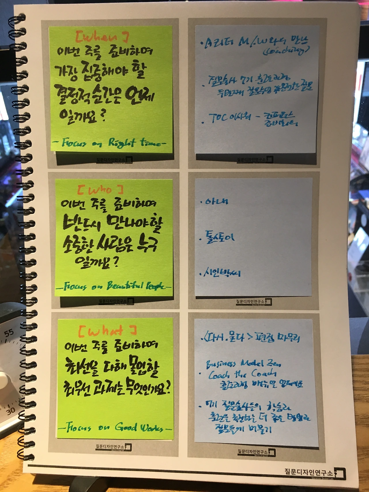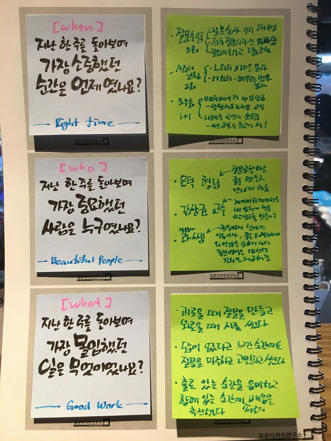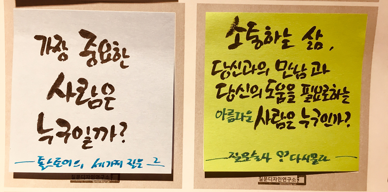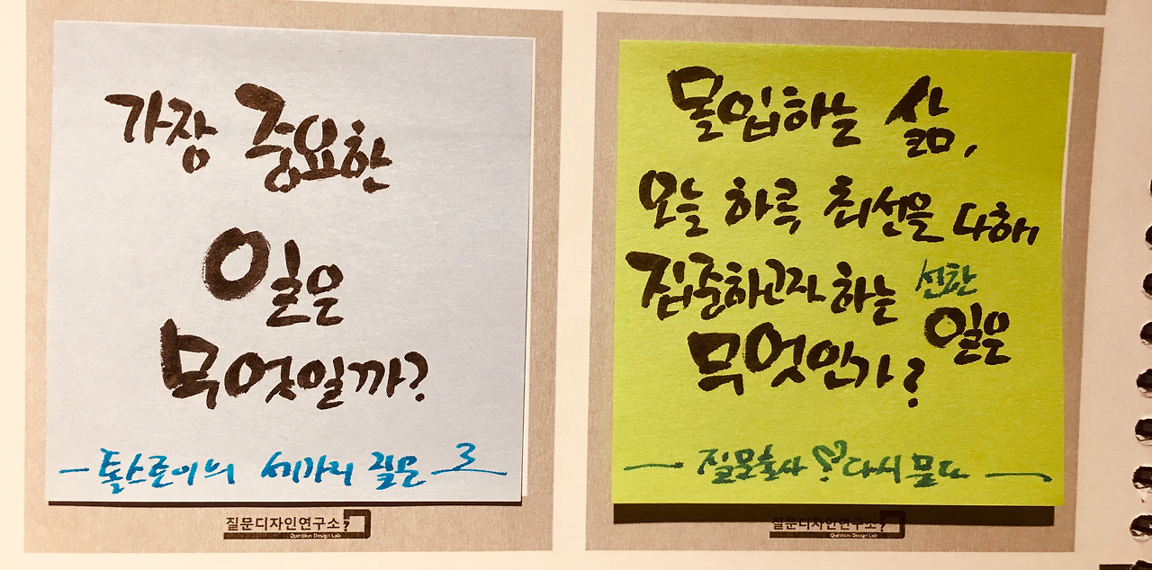 저는 톨스토이의 세 가지 질문이 인류의 삼대 가치라 불리는 진/선/미를 반영하는 질문이라 여기고, 진실한 순간, 아름다운 만남, 착한 일을 실천하고, 기록할 수 있도록 노트 하나 만들어 봤습니다.