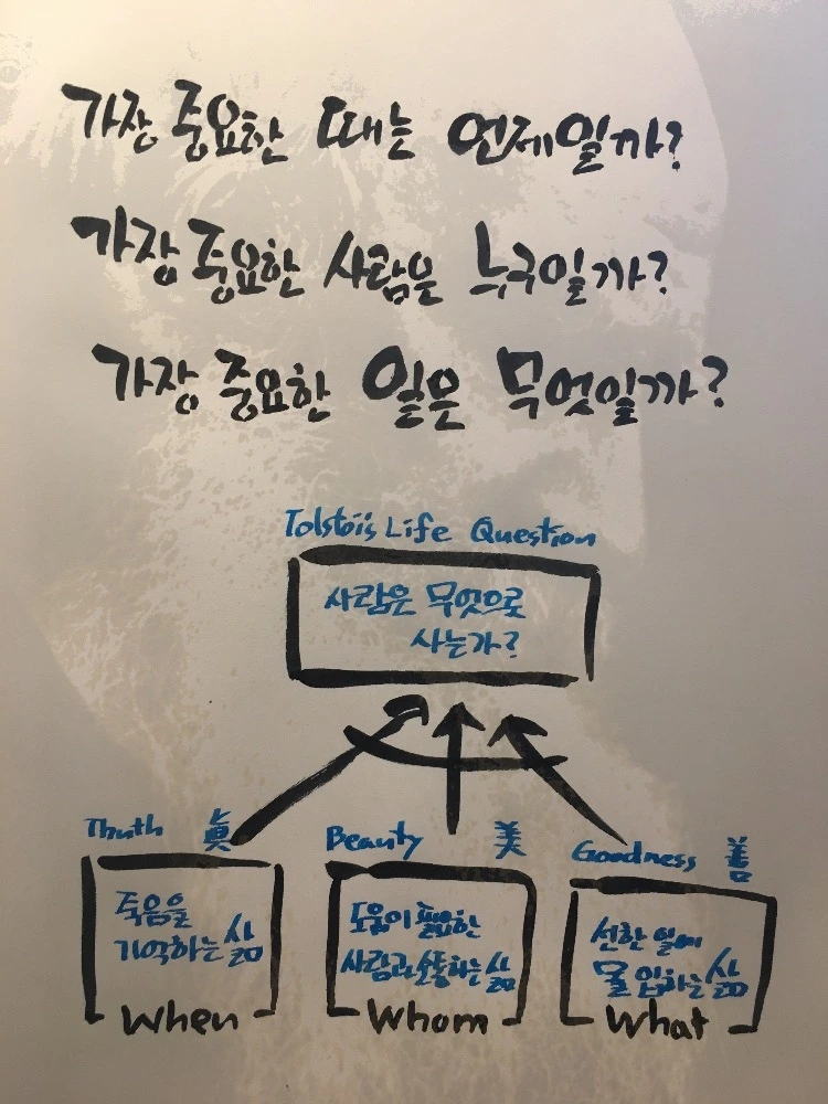 톨스토이는 늘 성장하는 삶을 강조하고, 독자들에게 성찰을 권하곤 했습니다. 물론 스스로도 모범을 보이셨고요. 돌스토이의 질문과 가르침을 제 나름대로 한 장으로 요약하자면 다음과 같습니다.