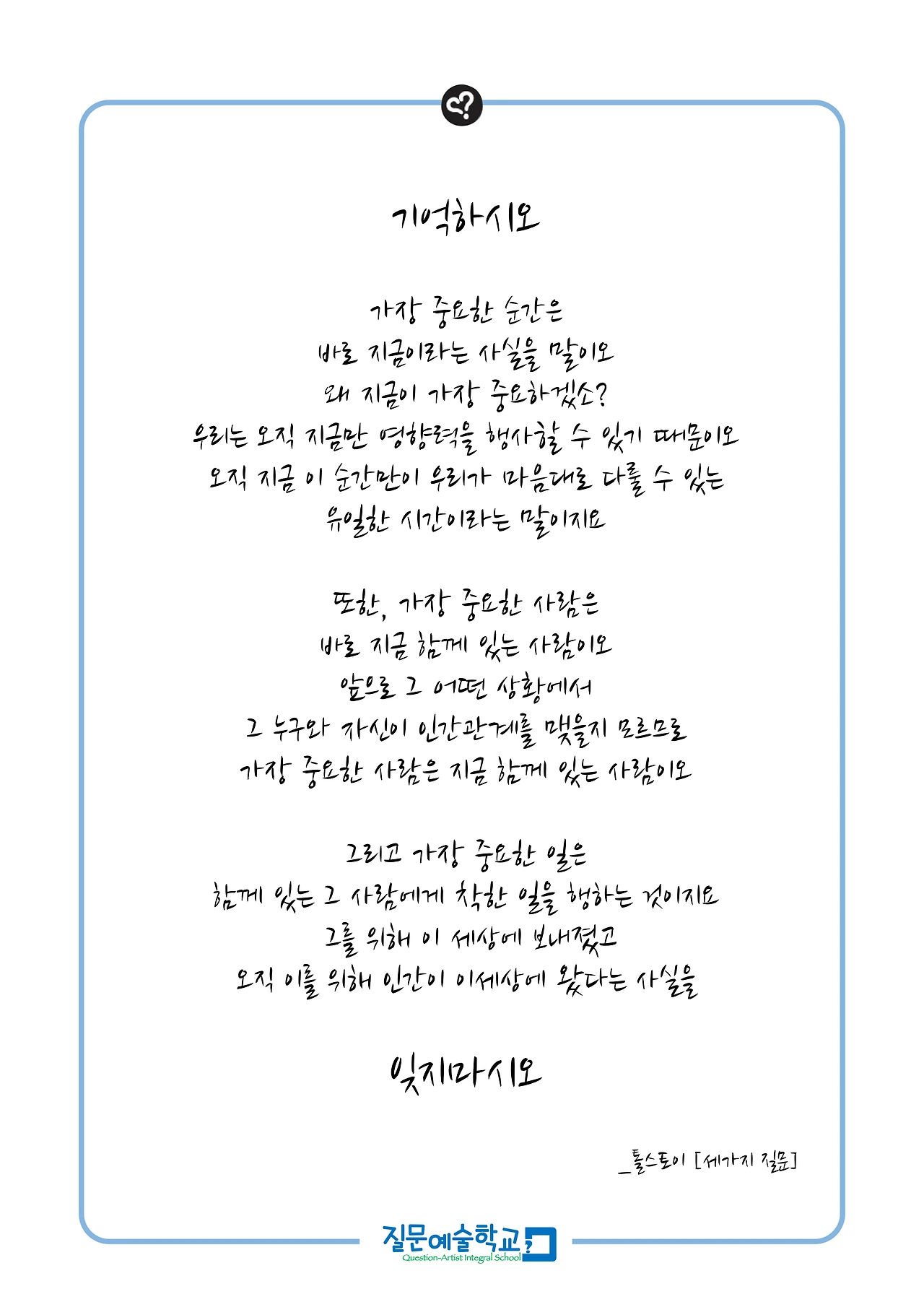 잠깐 시간을 내어 세 가지 질문을 옮겨적고, 톨스토이의 글도 음미하는 시간을 가져봤으면 합니다. 당장 자신의 답이 떠오르지 않아도, 질문 그 자체를 음미해보는 것도 좋을 듯합니다. 매주 톨스토이의 세 가지 질문에 머물러 보고자 성찰 질문 노트를 만들어서 하단에 첨부에 두었습니다. 끝까지 읽고 필요하신 분들은 출력해 활용해 주셨으면 합니다.