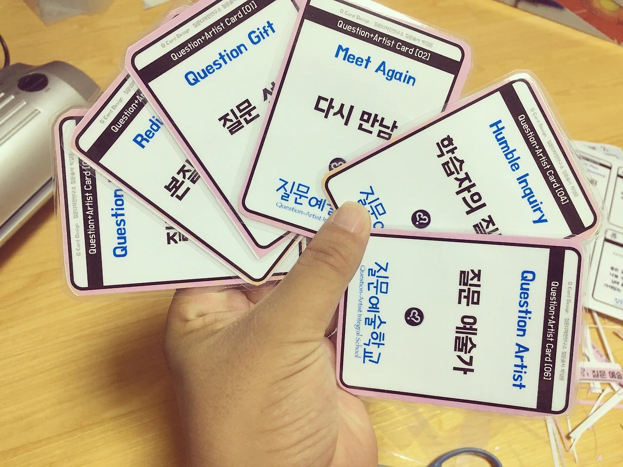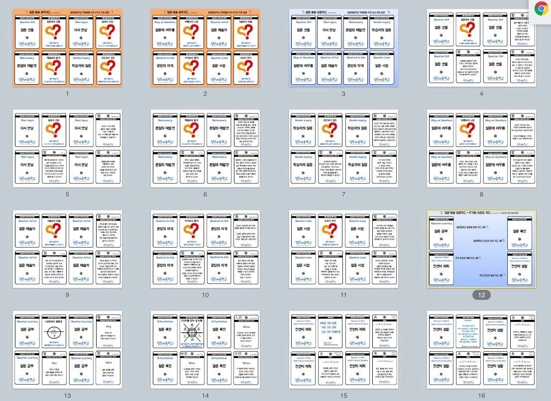 이번에 제작해 보려는 ’질문성찰 지침카드’는 정식으로 상품 출시를 고려해보고 있습니다. 초안으로 만든 카드가 총 48장 정도가 되니, 질문카드 1셋 정도로 적당한 듯 보입니다. 교구 제작을 하시는 회사와 협의해보고, 정식 출시를 검토해보겠습니다.