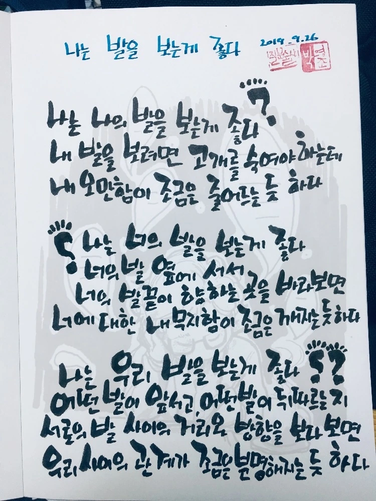 마흔이 지난 후로는 말을 듣는 것 보다 발을 보는게 점점 더 좋아지고 있다. 질문을 잘 하고 싶은 이들에게 농담삼아, ‘발을 보라’고 말하곤 한다. 말에 담긴 질문은 가끔 너무 가볍다. 말없는 발이 질문의 깊이를 더하곤 한다. 발가락 질문카드도 슬슬 만들어보고 싶다.
