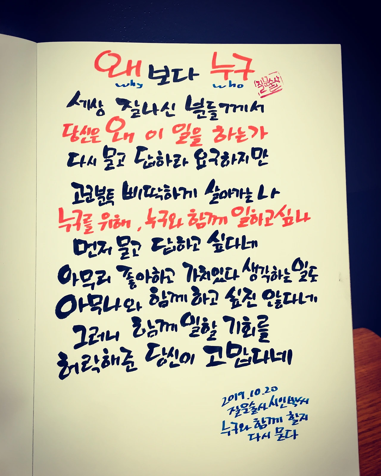 제가 거절하는 것은 당신이 잘못한 게 있어서가 아니고, 제가 수락하는 것은 제가 잘할 수 있는 일이여서는 아닙니다. 늘 고맙고 미안한 마음으로 살아가고 있습니다.
