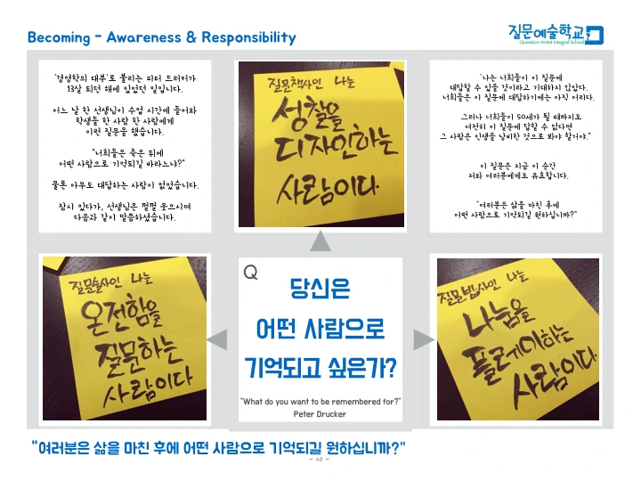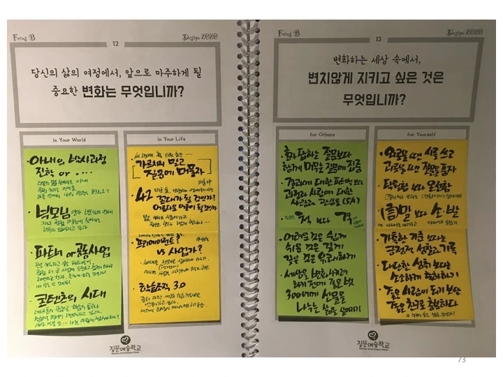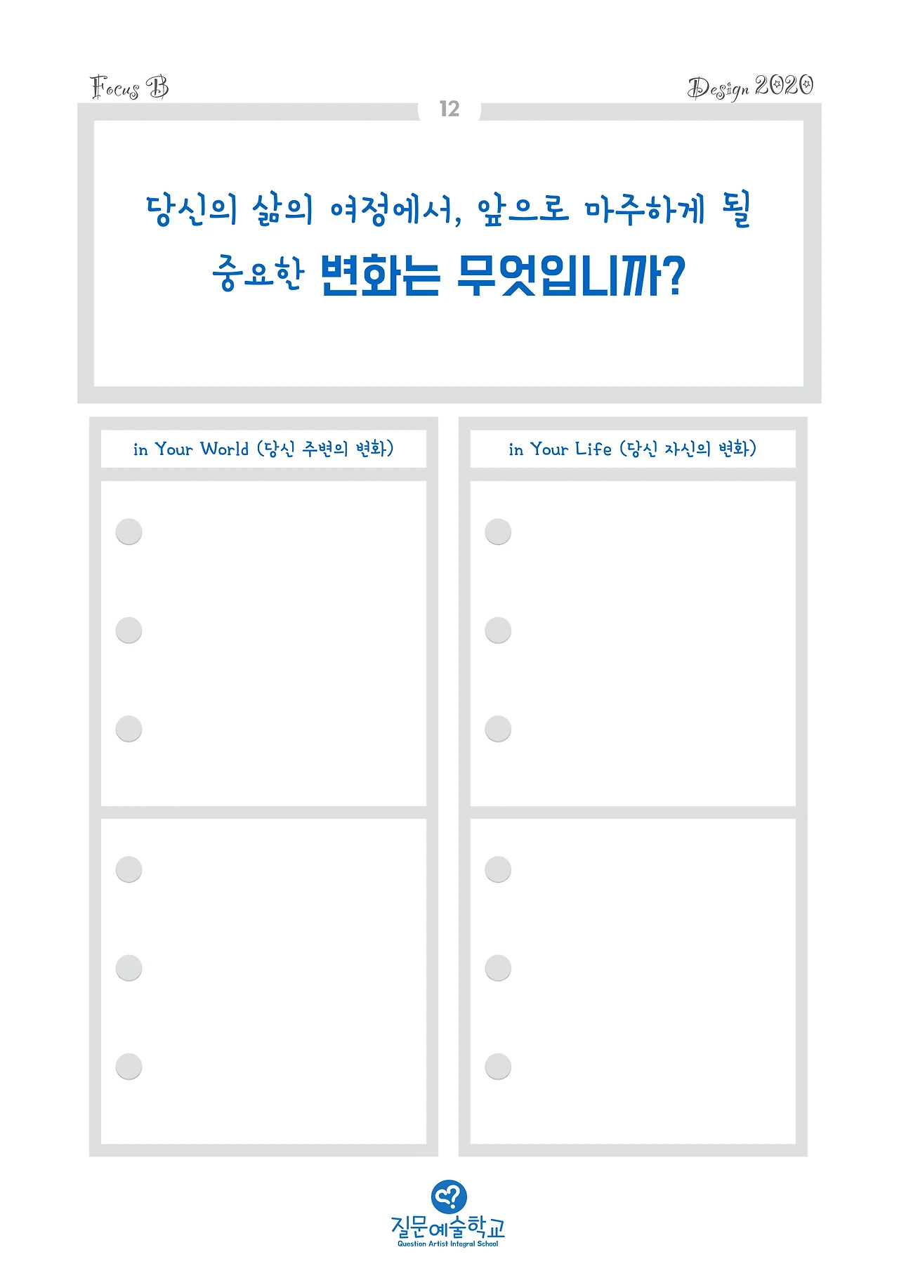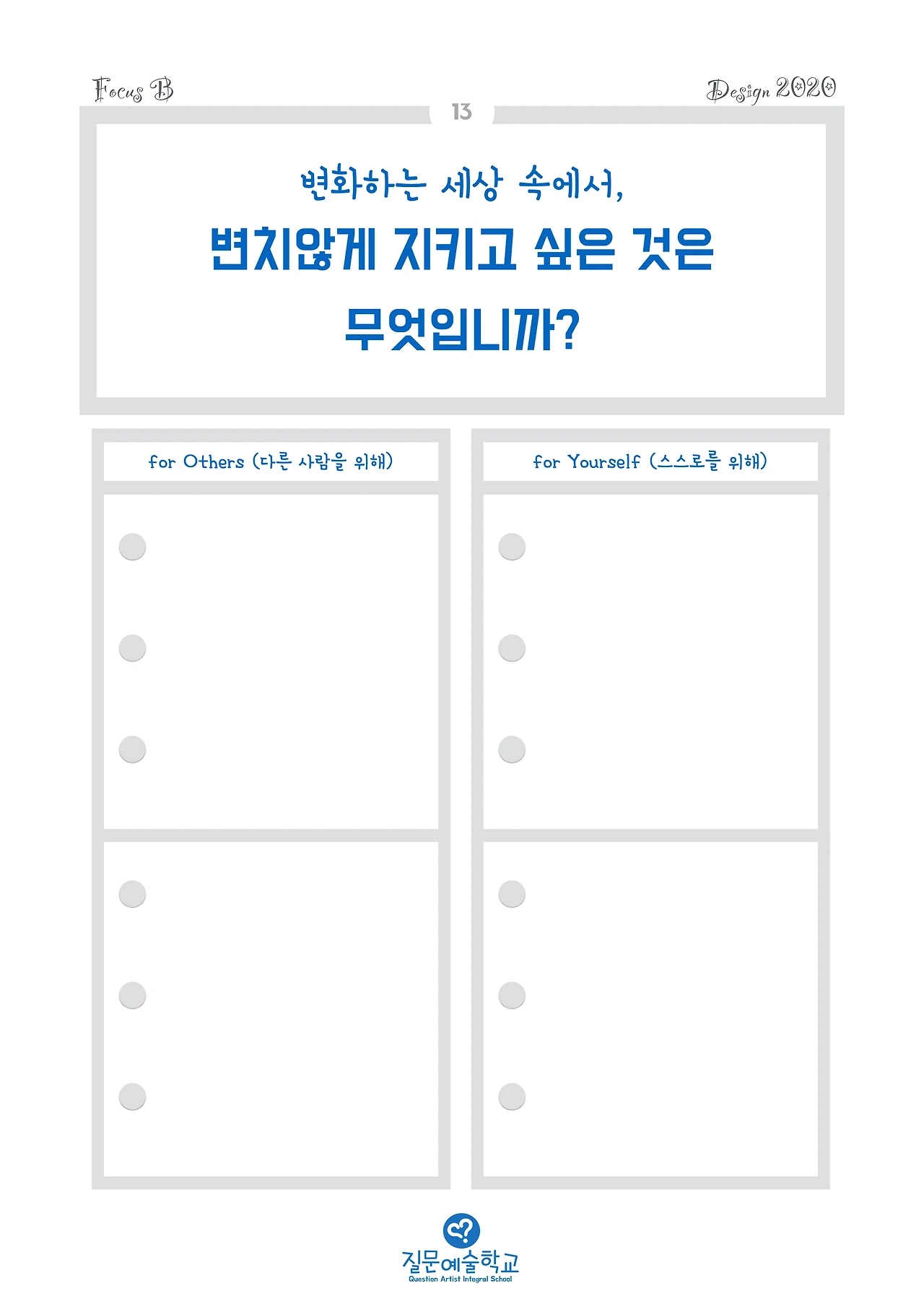 나를 둘러싼 주변 세상의 변화 / 내게 다가오는 직접적인 변화들을 먼저 정리해 봅니다. 그리고 나서 타인과 자신을 위해서 변치 않게 지키고 싶은 원칙을 세워보시길 권합니다.