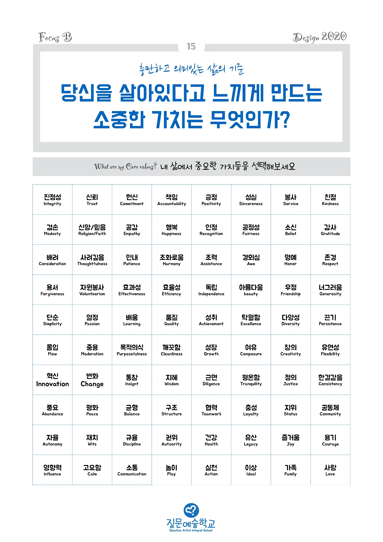 다양한 가치들 중에서 여러분이 집중하고 싶은 가치를 6개 이내로 선정해 보셨으면 합니다. 예시로 적어둔 가치 단어 목록은 참조만 하시고, 스스로 단어를 만드셔도 됩니다.