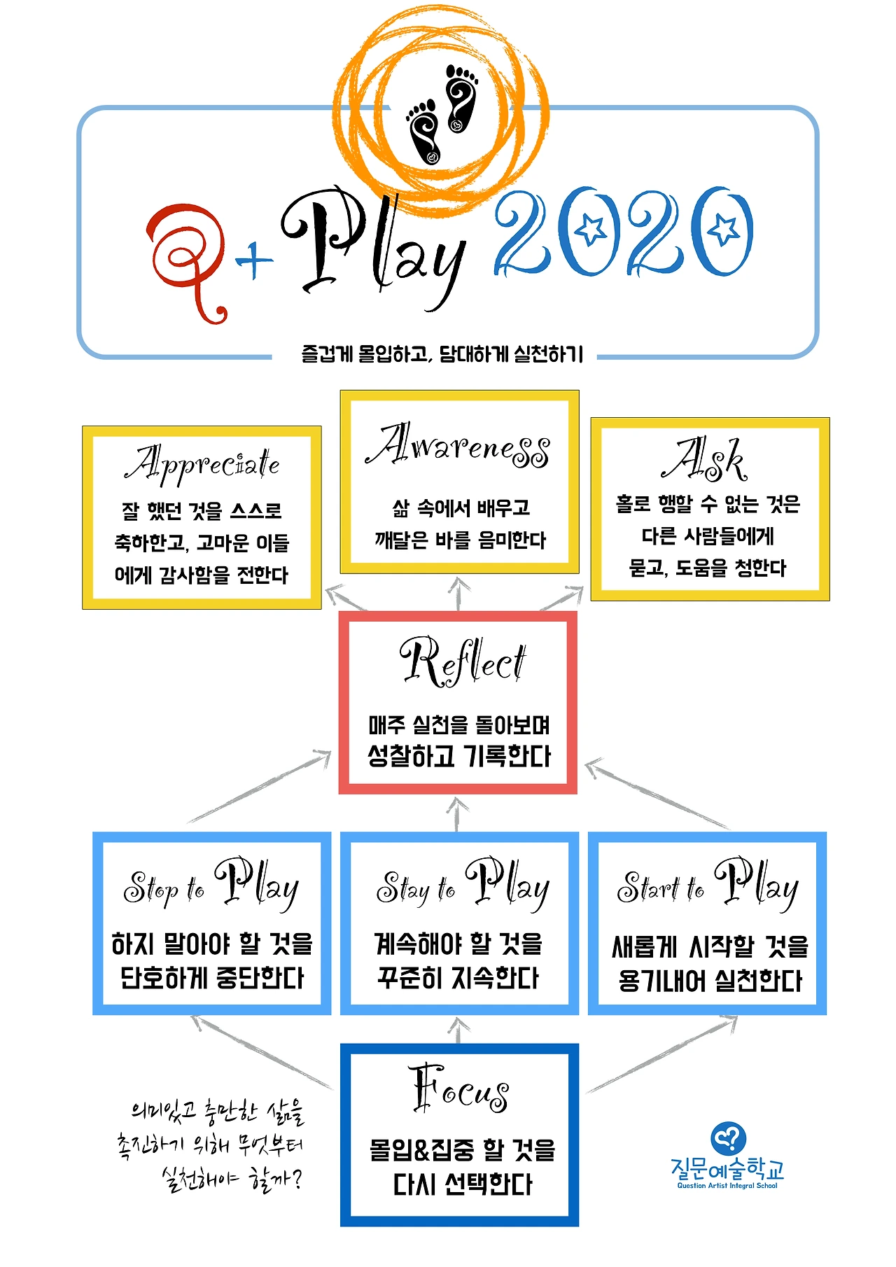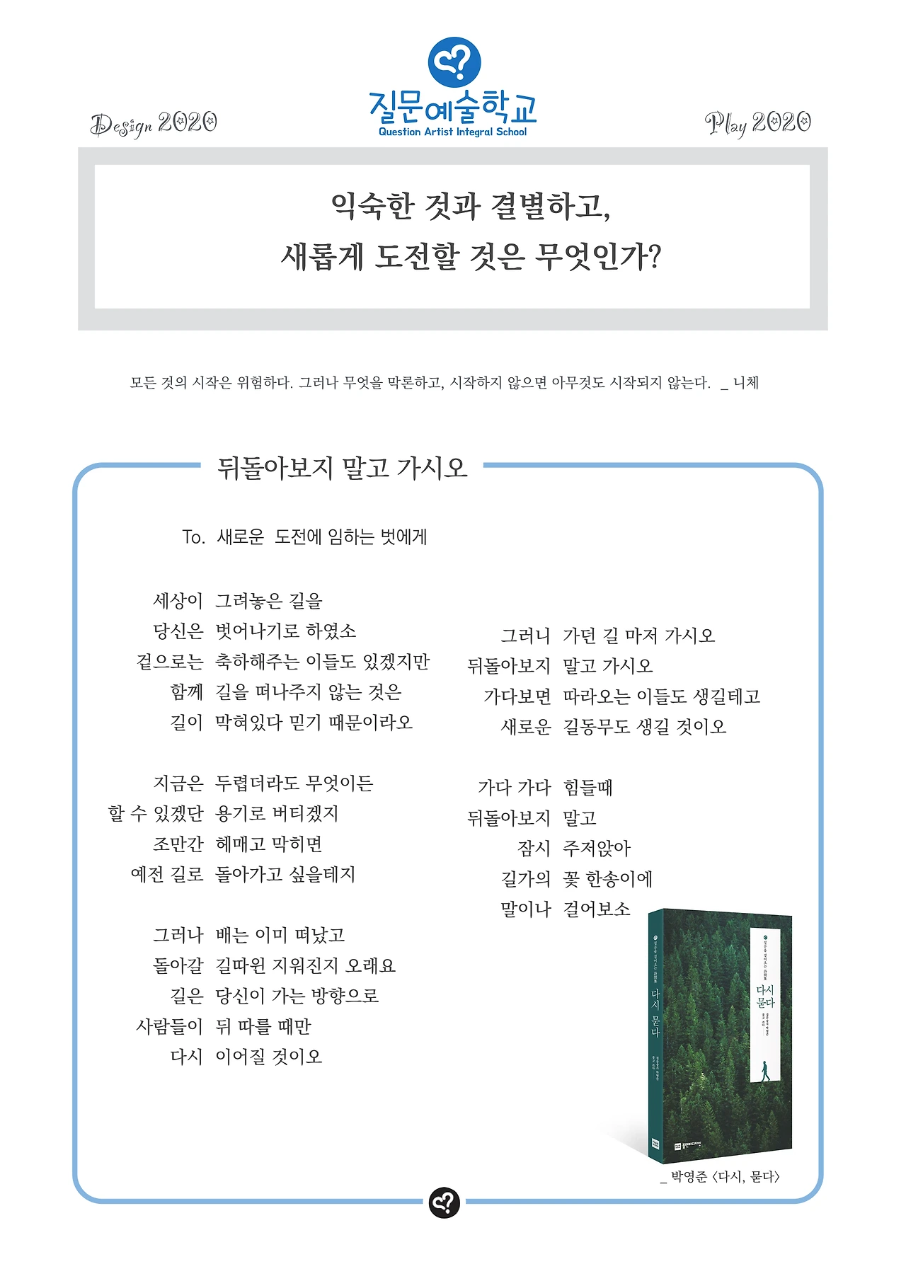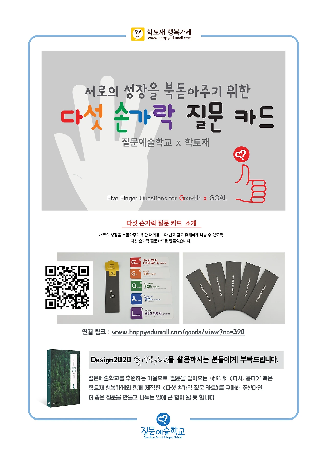 본 Design2020 Q+Playbook은 저작권자의 동의 하에 제삼자에게 무료로 공유할 수 있습니다. 다만, 질문예술학교를 후원하는 마음으로 질문술사의 시집 <다시, 묻다> 혹은 학토재 행복가게와 함께 제작한 <다섯 손가락 질문 카드>를 구매해 주신다면 더 좋은 질문을 만들고 나누는 일에 큰 힘이 될 듯합니다.