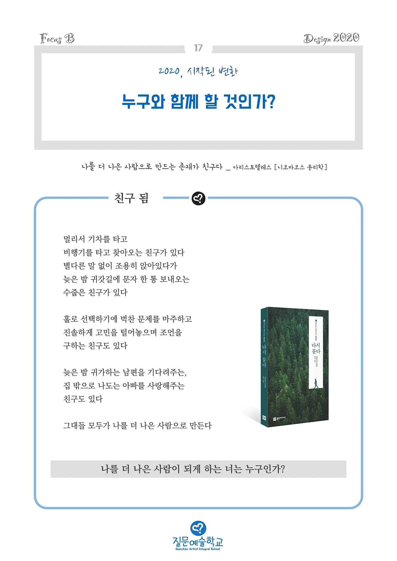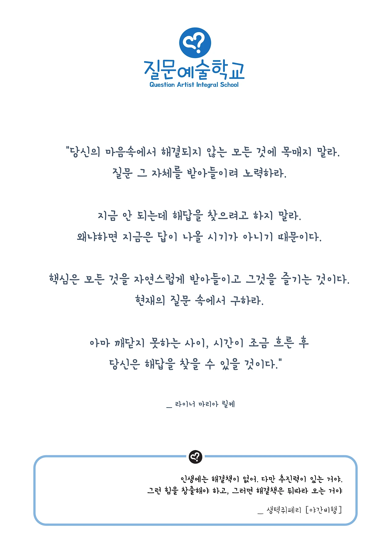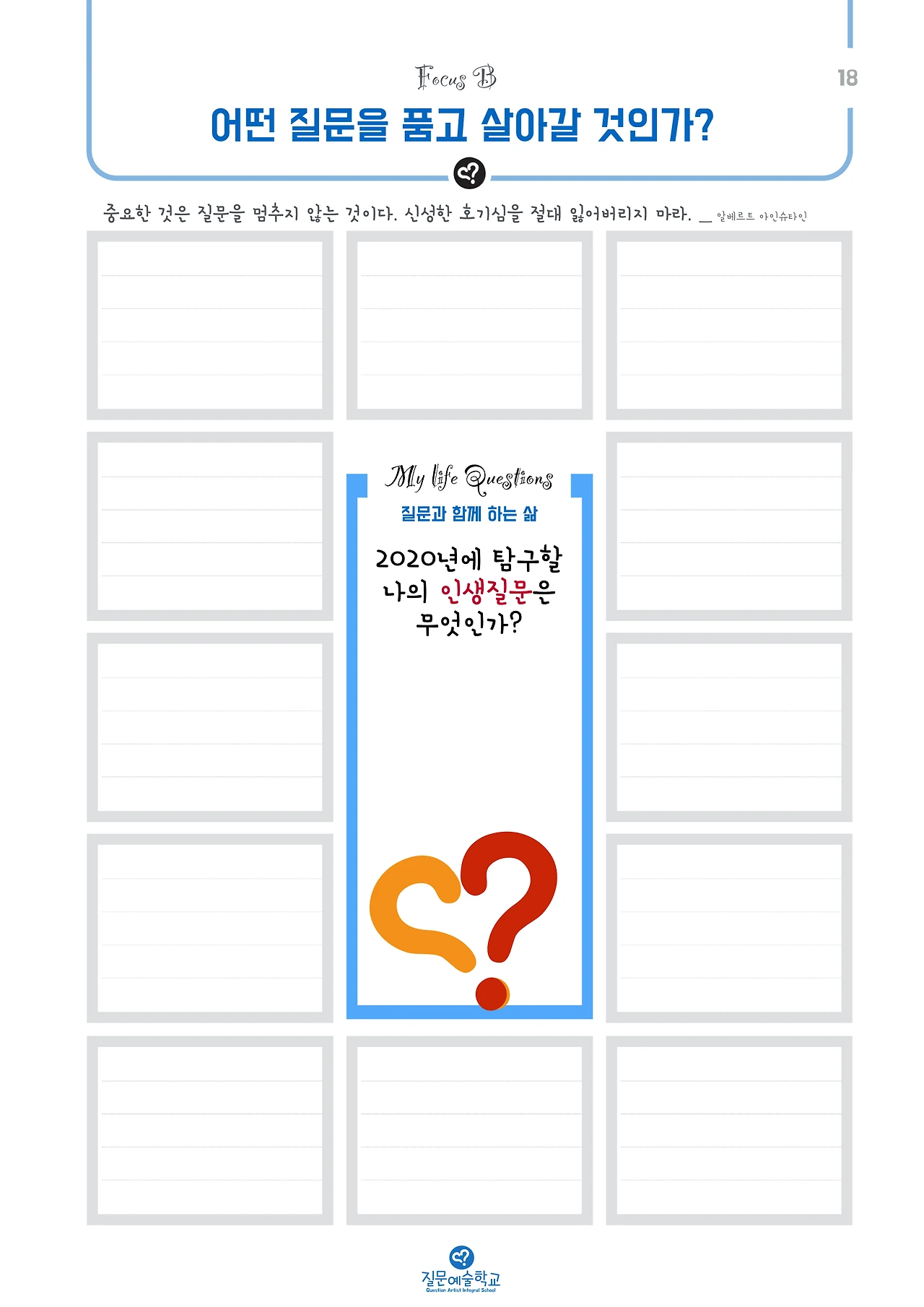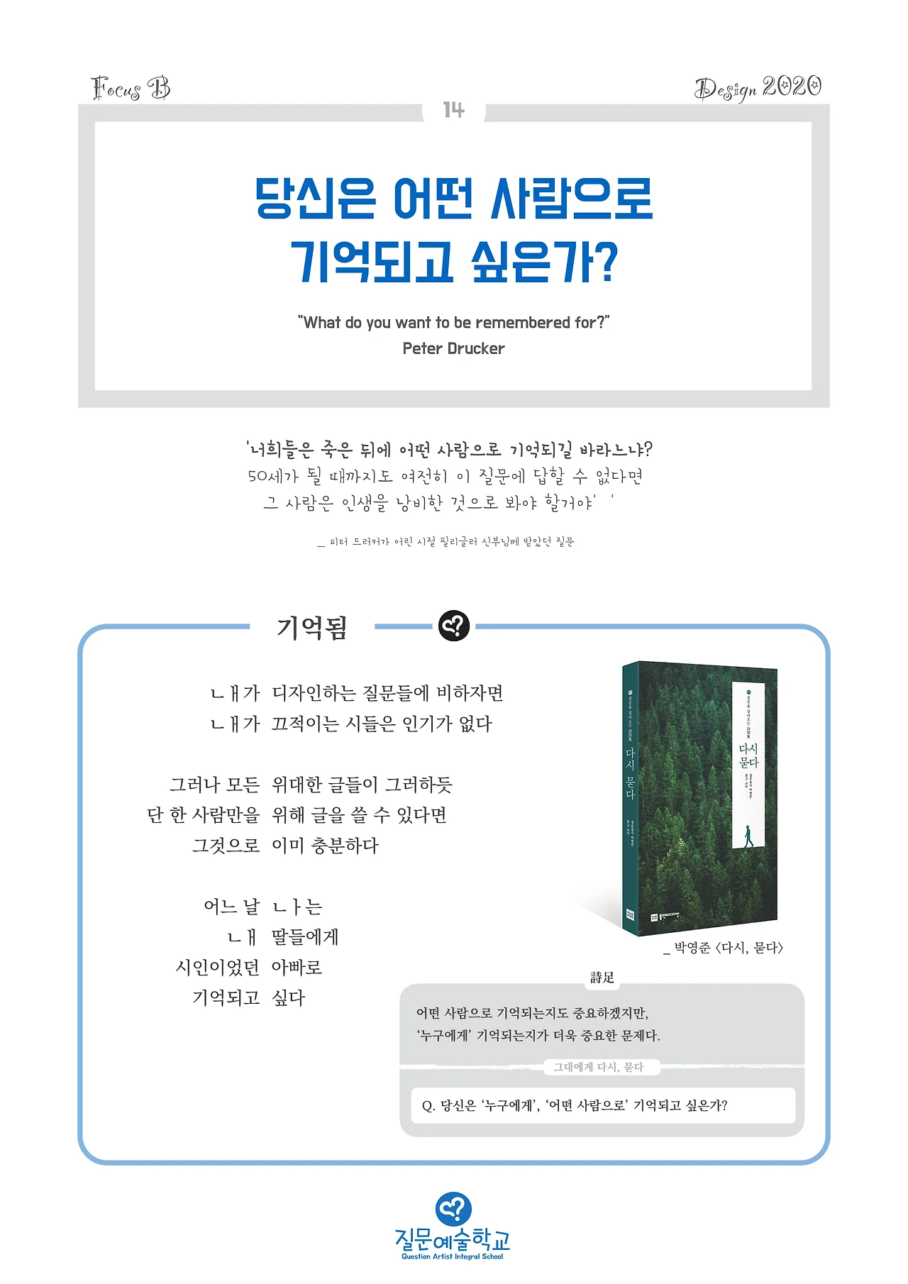 본 Design2020 Q+Playbook은 저작권자의 동의 하에 제삼자에게 무료로 공유할 수 있습니다. 다만, 질문예술학교를 후원하는 마음으로 질문술사의 시집 <다시, 묻다> 혹은 학토재 행복가게와 함께 제작한 <다섯 손가락 질문 카드>를 구매해 주신다면 더 좋은 질문을 만들고 나누는 일에 큰 힘이 될 듯합니다.