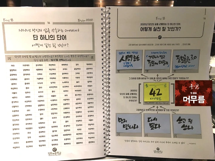 질문노트 양식에는 '야심찬 도전 목표'라고 거창하게 질문을 만들었지만, 개인적으로는 작고 소소한 도전 목표도 좋다고 생각합니다. 가운데 칸에는 올해의 한 단어를 다시 붙여두었습니다. 멋물음은 '머무름'이란 한 단어를 변경한 말장난 같은 것입니다 ^^;