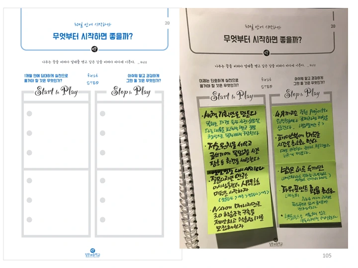1년 목표를 세워두면 365일이나 남았다는 생각으로 실천을 미루게 되는 것 같아 20번째 질문은 30일 안에 시작할 것과 그만둘 것으로 정리해봤습니다.
