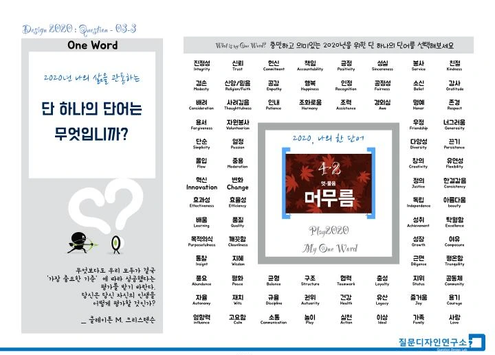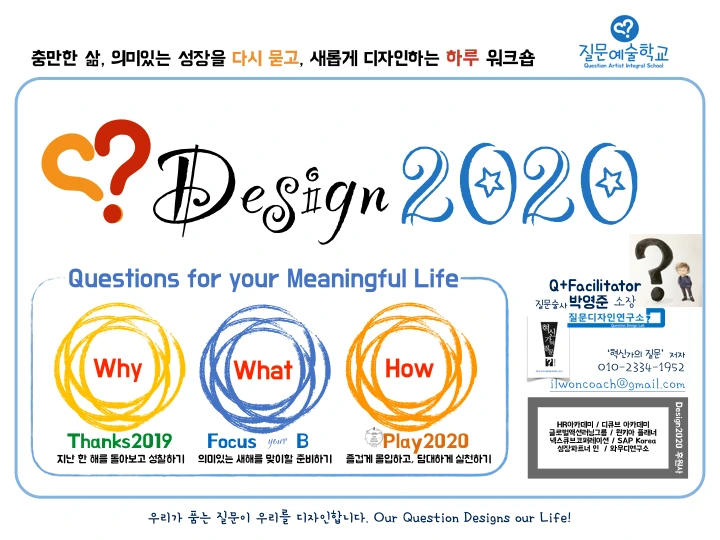 Design2020 Q+Playbook을 활용해 코칭 및 워크숍 형태로 제삼자에게 활용하고자 하는 경우 궁금한 점이 있으면 박영준 코치(010-2334-1952, ilwoncoach@gmail.com)에게 행사 전에 간단하게라도 연락 남겨주시길 부탁드립니다.