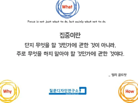 그렇다면 우리는 왜 '소중한 것을 먼저하라'는 금언을 실천하는 것을 그토록 어렵게 느끼는 걸까요? 소중한 것을 먼저하기 위해서는 무엇에 집중해야 할까요? 하루 하루 일정관리표에 소중한 것을 먼저 기록해두고 실천하는 것 만으로 충분할까요? 소중한 것에 집중하지 못하도록 하는 걸림돌과 제약이 무엇인지 먼저 살펴보는 것은 어떨까요?