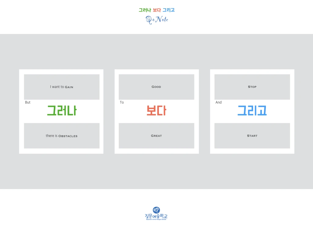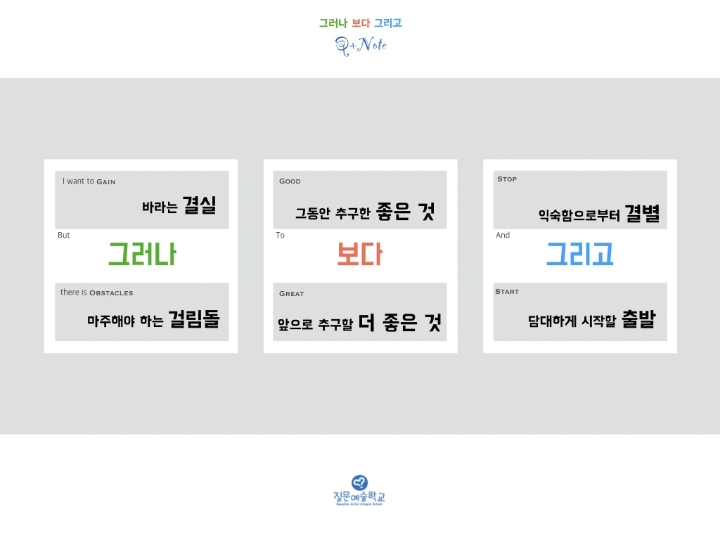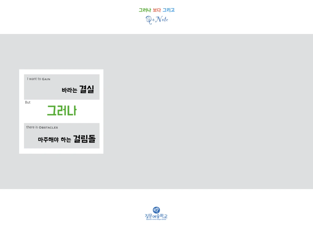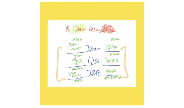 : 지난밤에 잠들기 전에 끄적여둔 메모가 있었다. ‘그러나 / 보다 /그리고’라는 세 단어를 활용해 성취를 돕고, 생각을 정리해보는 빈칸 넣기 형식의 질문노트를 만들어보고 싶어졌다. 일단 세 단어를 통해 점검하고 싶은 핵심 콘셉트를 잡아보았다.