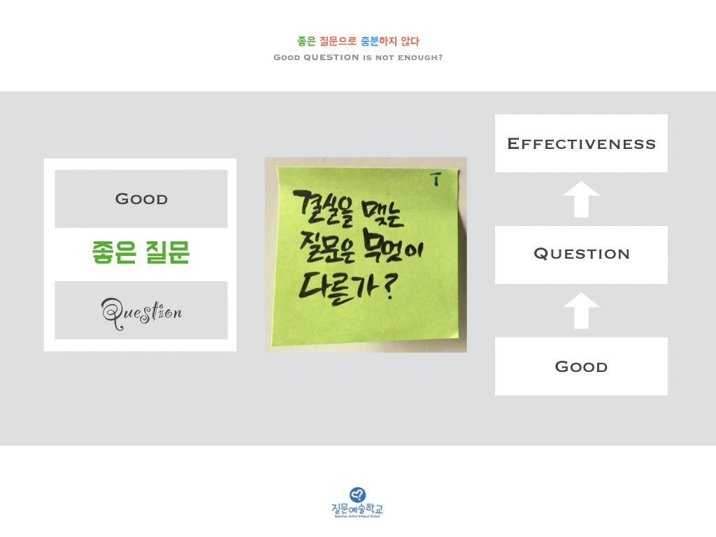 그리고 바라는 결과를 만드는데 도움이 되는 질문을 편의상 좋은 질문(Good Question)이라고 해 봅시다. 문제 해결보다 문제 발견이나 문제정의가 중요하다고 주장하시는 분들이 있고, 이런 분들은 저처럼 질문의 중요성을 매우 강조하곤 합니다. 그중 일부는 새로운 결과, 특히 원하는 결과를 만들어 내는 질문에 관심을 갖습니다.