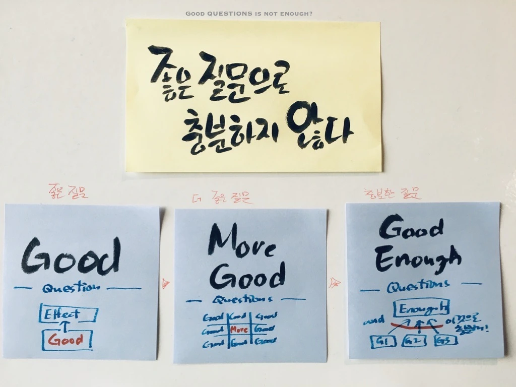 바라는 결실을 맺는 효과적인 질문은 무엇이고, 그런 질문을 더 잘할 수 있도록 돕는 조건을 고민하고 있습니다. 이 글은 ‘좋은 질문(Good Question)’과 ‘충분한 질문(Good Enough Questions)’의 차이를 분별할 수 있도록 돕기 위한 첫 번째 토막글입니다. 다음 글에서는 어떻게 하면 더 좋은 질문을 발견하고, 충분히 좋은 질문을 선택하는 것에 대해 다루고자 합니다.