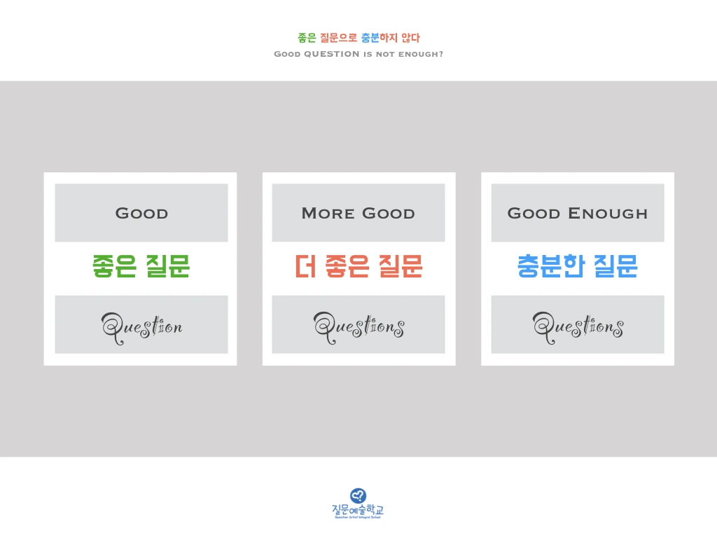 세상에는 좋은 질문이 참 많습니다. 그러나 그 좋은 질문들이 우리에게 충분하다는 느낌을 주진 못합니다. ‘좋은 질문’에서 멈추지 말고 ‘충분히 만족스러운 질문’ 을 찾아가는 여정을 안내해보려고 합니다.