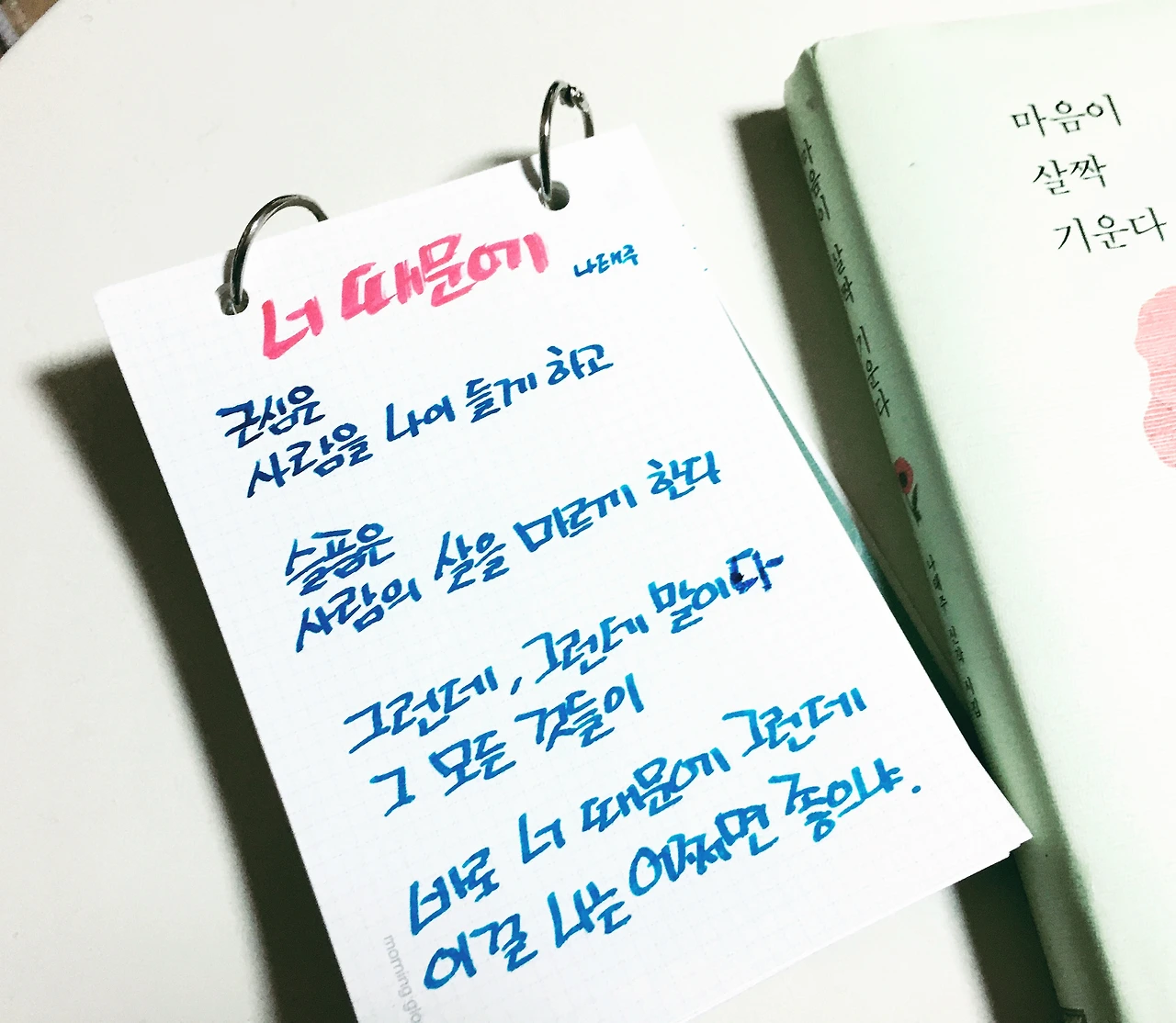 ‘종이 위에 직접 글을 쓰는 것’과 ‘손가락 두드려 글을 쓰는 것’ 사이에서 종종 무엇을 택해야 하나 고민한다. 손가락을 두드려서 컴퓨터로 원고를 쓰면 부끄러운 표현을 수정하기 용이하다. 종이 위에 쓰는 방식은 번거롭게 느껴지기도 하지만, 한 글자 한 글자 느리게 쓰면서, 내가 쓴 글들과 호흡하는 느낌이 들어서 좋다. 둘 다 일장 일단이 있으니, 요즘엔 먼저 종이를 꺼내 붓펜이나 만년필을 붙잡고 끄적끄적 쓰다가, 손가락으로 타닥타닥 옮기며 고쳐 쓴다.