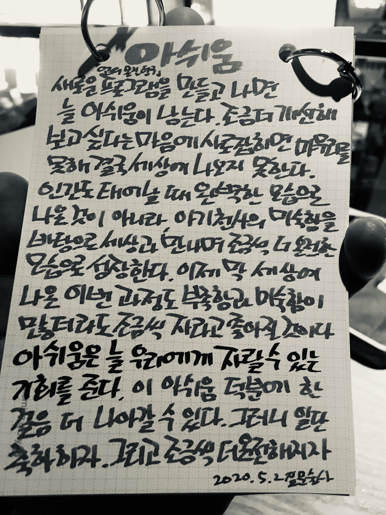 이제 막 세상에 나온 ‘업의 본질 탐구 질문 워크숍’도 돌아보면 부족하고 아쉬운 부분이 많다. 그럼에도 불구하고 조금씩 더 자라고 좋아질 것이다. 아쉬움은 우리에게 자랄 수 있는 기회와 다시 시도할 용기를 이끌어낸다. 이 아쉬움 덕분에 한 걸음 더 나아갈 수 있다. 그러니 일단 축하하자. 그리고 조금씩 더 온전해지자.